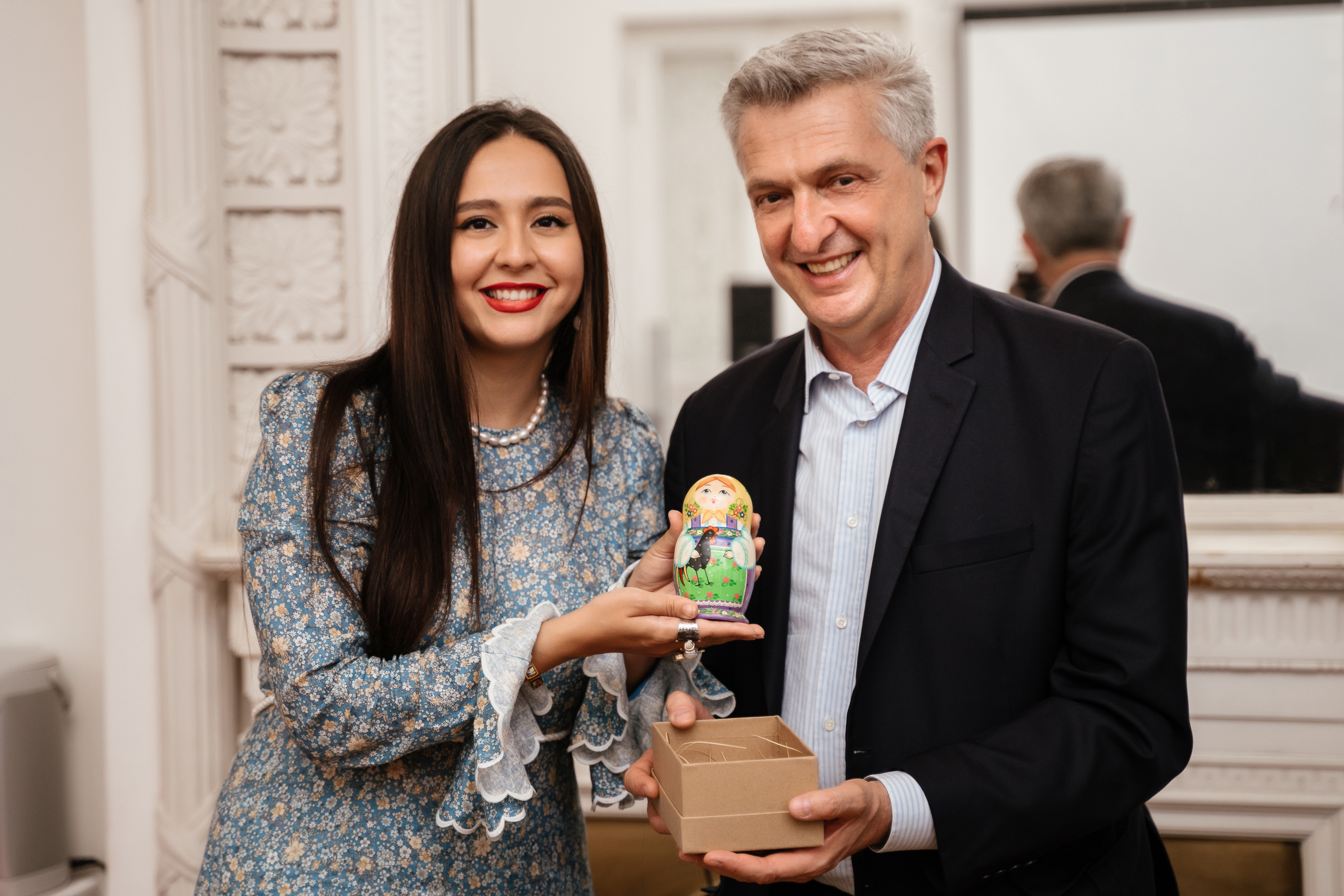 Посол доброй воли УВКБ ООН Манижа дарит матрешку Верховному комиссару ООН по делам беженцев Филиппо Гранди Фото: Руслан Альтимиров
