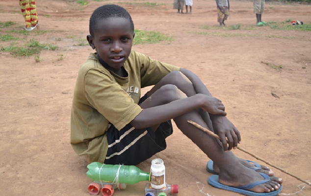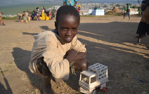 Fiston Iratuzi, 8, improvised his special truck from a plastic soda bottle, a medicine bottle, a bottle of alcohol tonic that he promises he did not drink, and eight wheels from water container caps and soda bottle tops – pulled with a string stripped from a grain sack. Fiston confides that if he could assemble a real-life truck, he would want to drive it to visit the home he misses in Burundi.