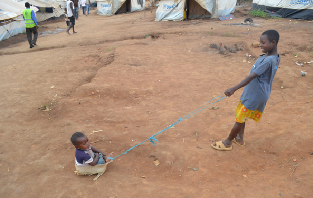Sandrine Kamariza, 11, pulls her sister Consolate, 2, every day in what the children call a “car” assembled from a crushed water container and a blue rope stripped from mosquito netting. Sandrine reports that she never tires of pulling her sister and that Consolate has never fallen out of her seat at any speed.