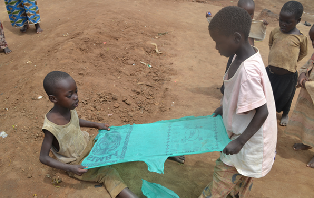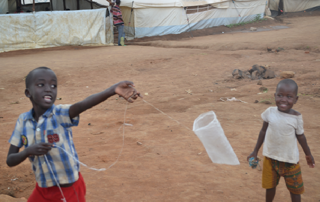Jean de Dieu Nsabimana, 10, and Stellebe Isengwe, 6, treasure a green plastic bag that they are manufacturing into a kite that they insist is really an “airplane”. Jean and Stellebe admit that they would prefer a football, but they say that at least their airplane is better than a bicycle, because they never had an opportunity to learn how to ride a bike.