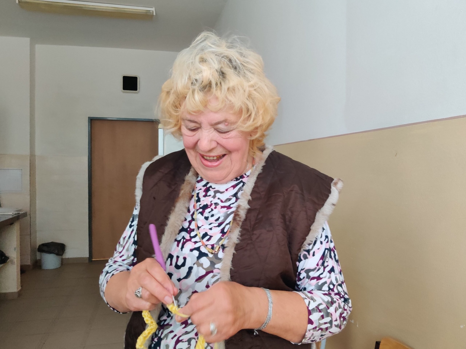 Zvuky nádherného ženského hlasu sa rozliehajú po celej hale záchytného tábora Migračného úradu v Humennom, na východnom Slovensku, 50 kilometrov od hraníc s Ukrajinou. Jedna z jeho obyvateľov, 77-ročná Albina, pletie a udáva rytmus spievaním ukrajinskej ľudovej piesne, Rushnichok („Ručníček“), ktorá je o túžbe po domove.