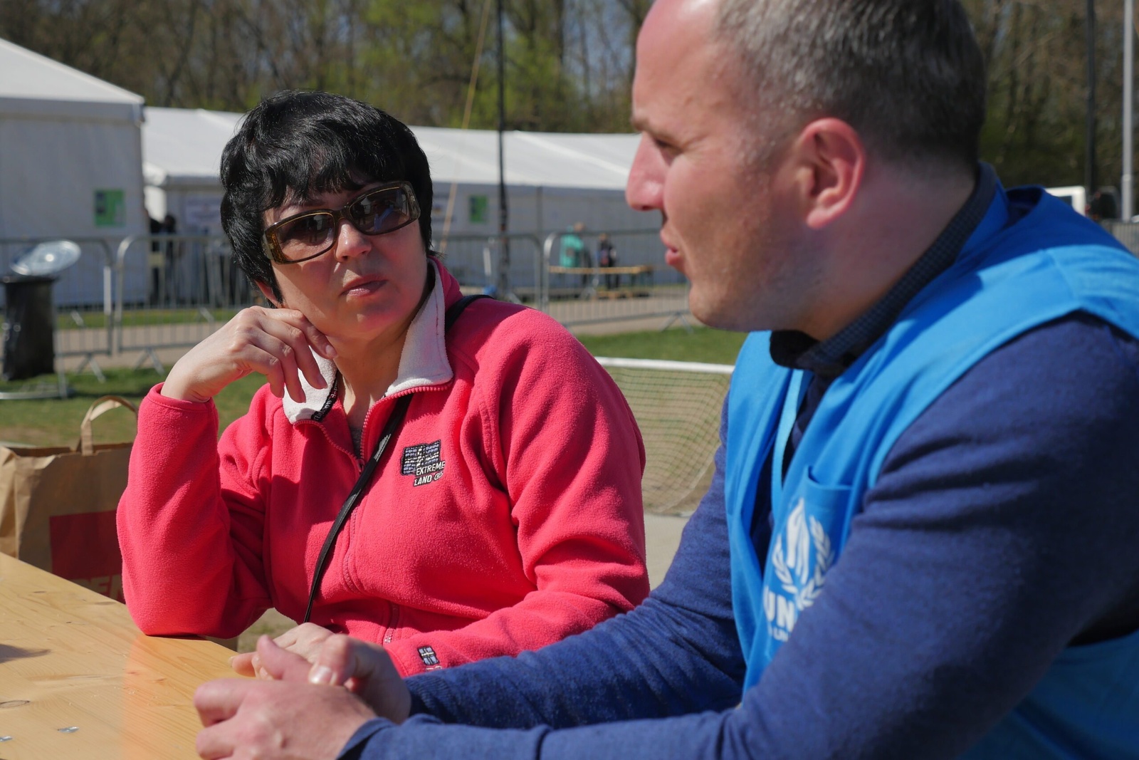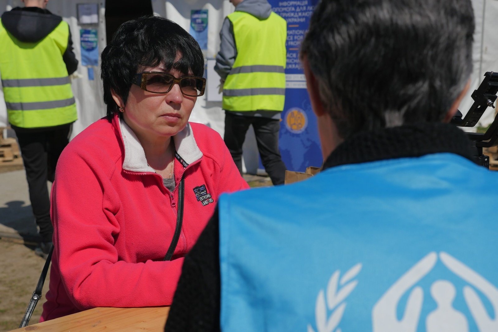 Potrebujú chvíľu na rozmyslenie a niečo na jedenie. Vytiahnu sendviče, ktoré si priniesli z Ukrajiny, chlieb je hrubý a upokojujúco známy. Horúci čaj zo slovenského stanu s jedlom im zdvihne náladu a pracovníci UNHCR sú nablízku, aby im pomohli zvážiť ich možnosti.