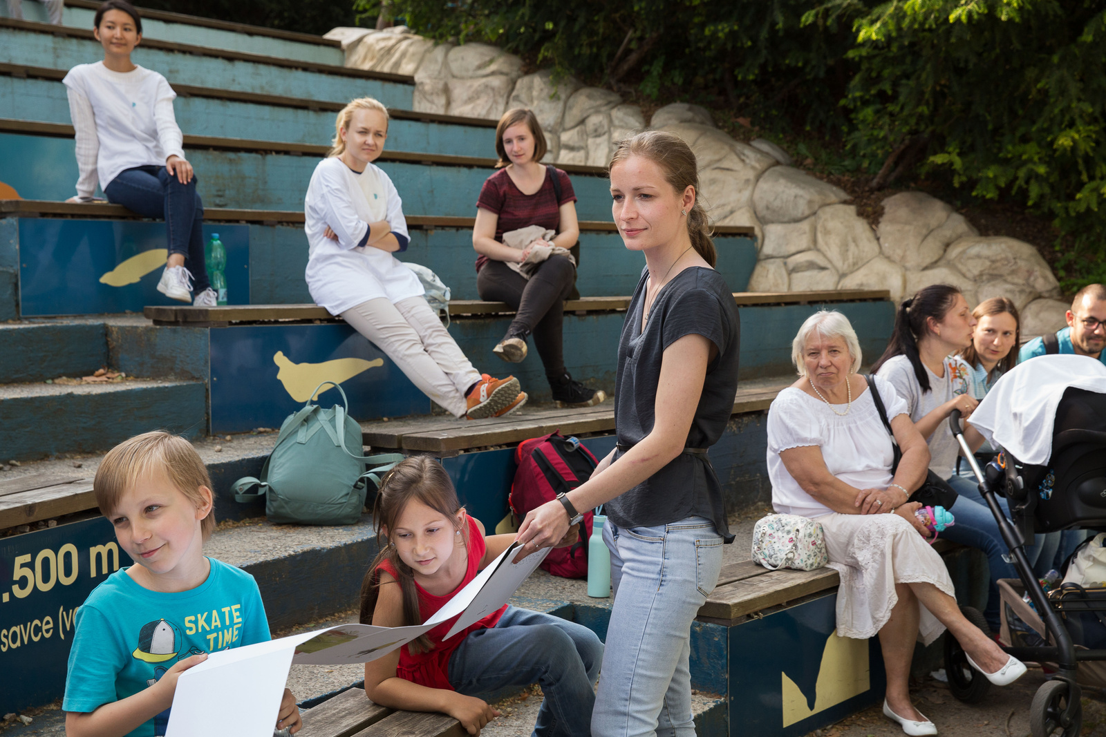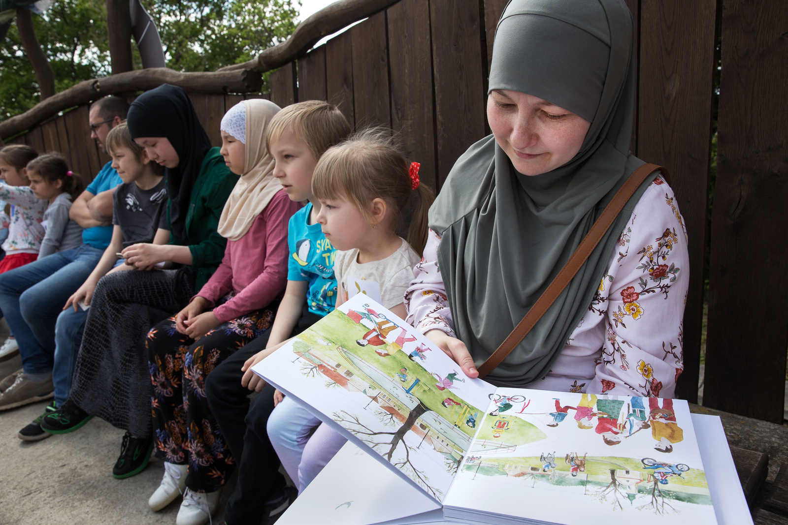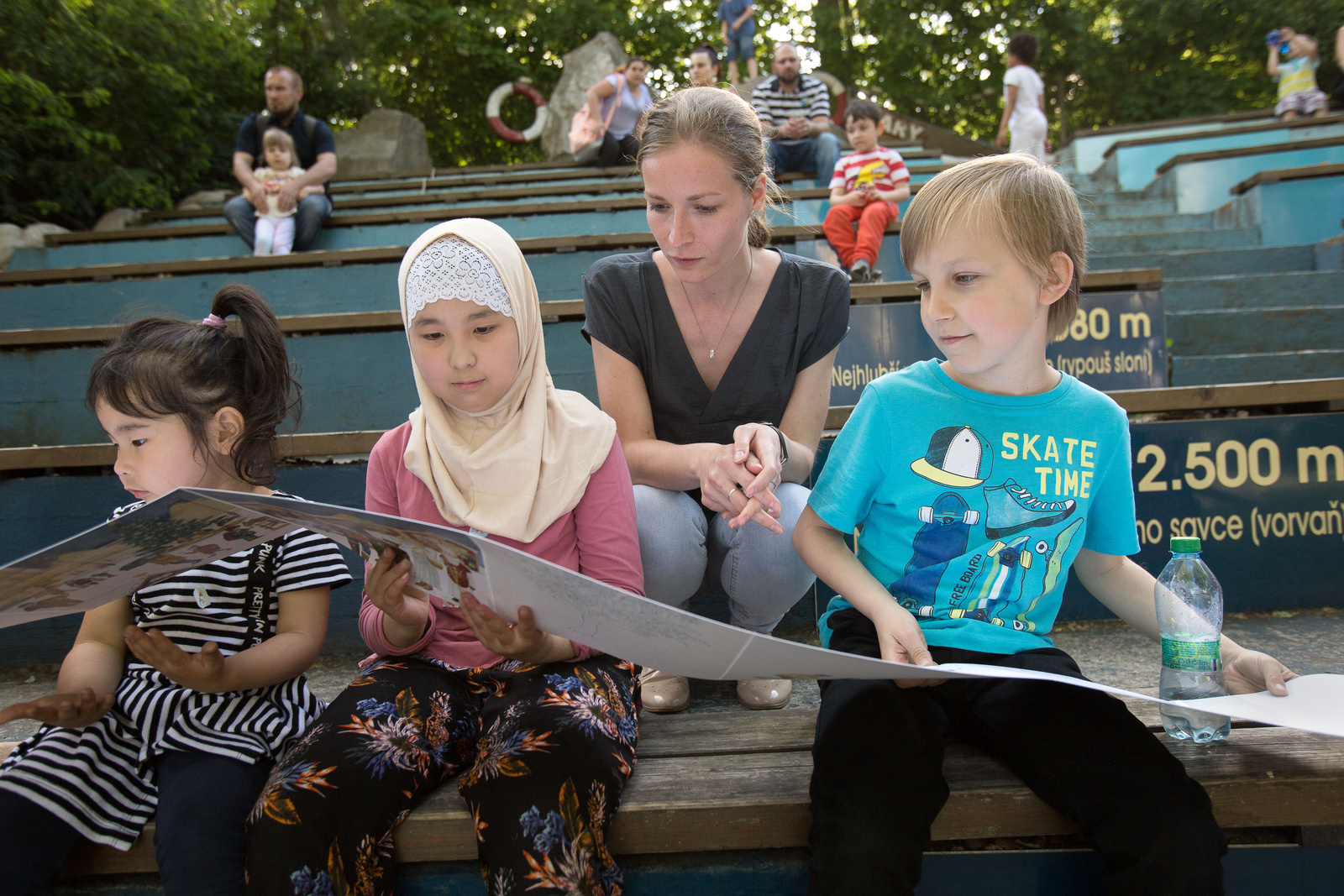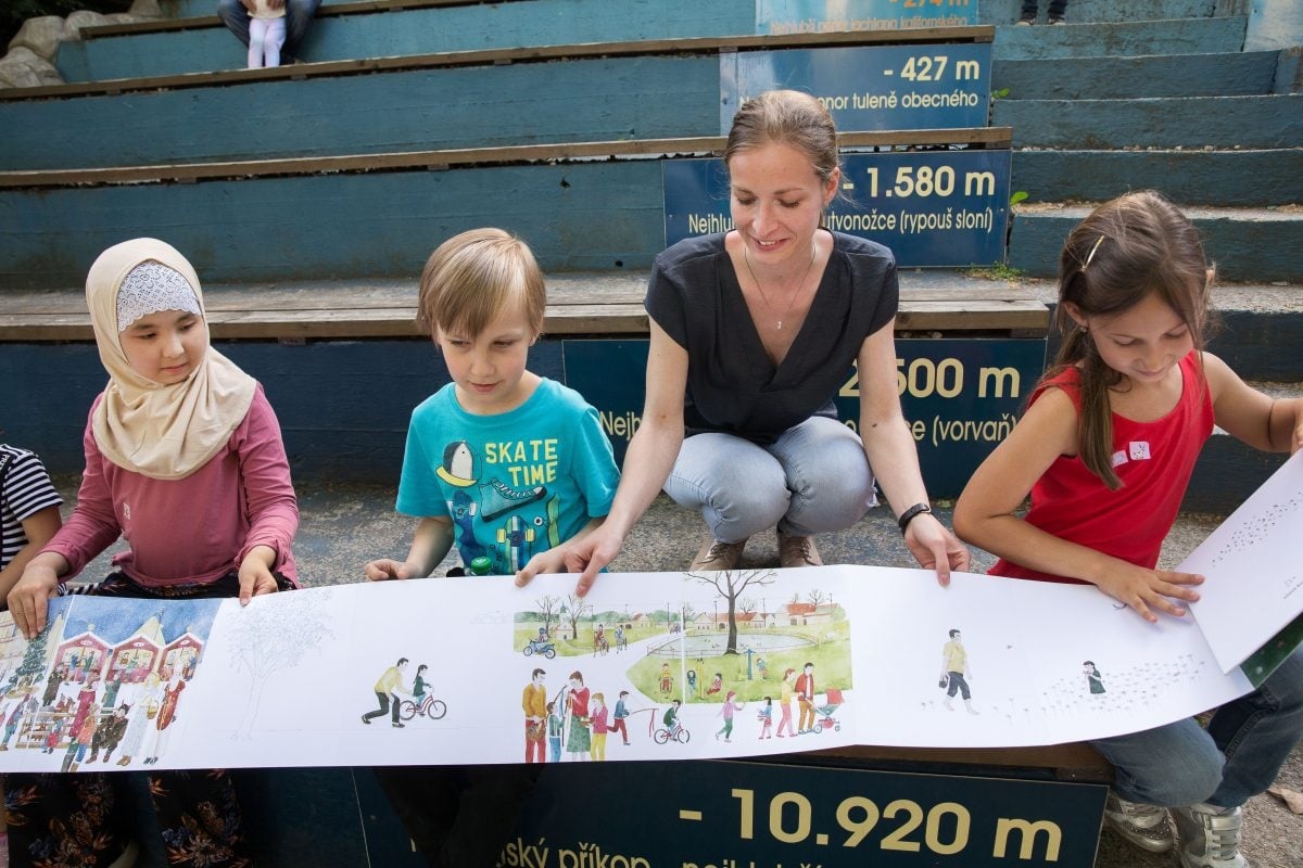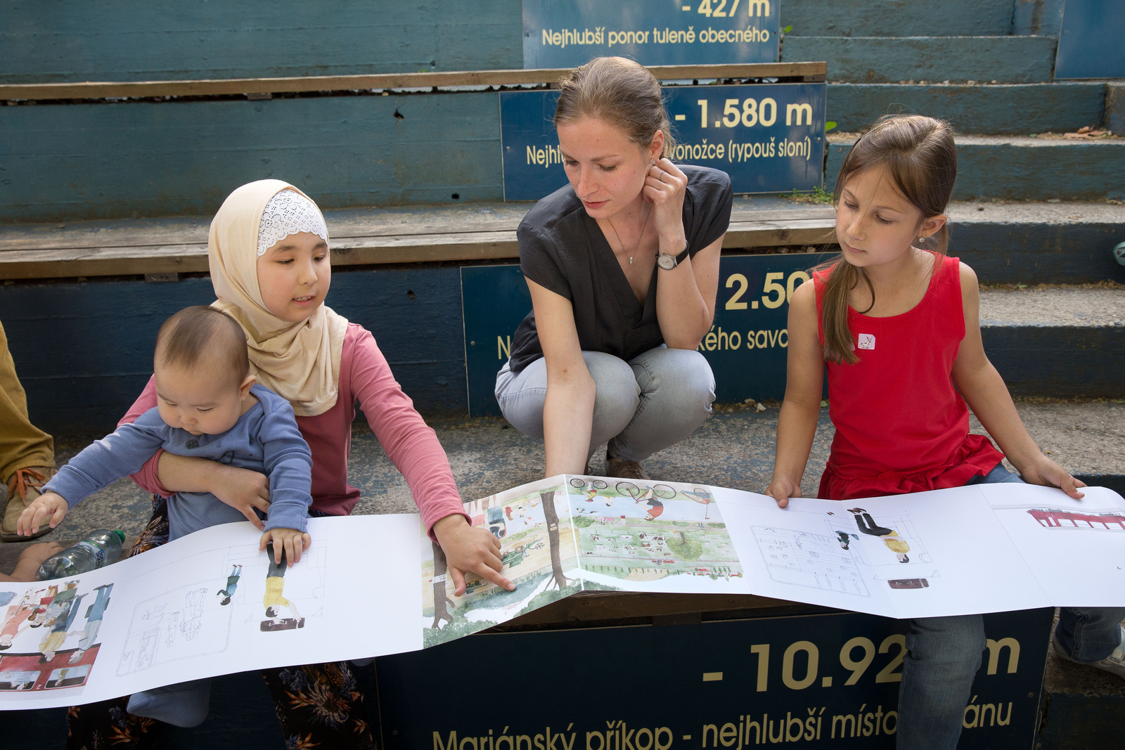 Tereza (29), ktorá vytvorila knihu Nový domov pre jej magisterský titul, ukazuje túto knihu utečeneckým deťom po prvý raz počas prechádzky v zoo v meste Ústí nad Labem.