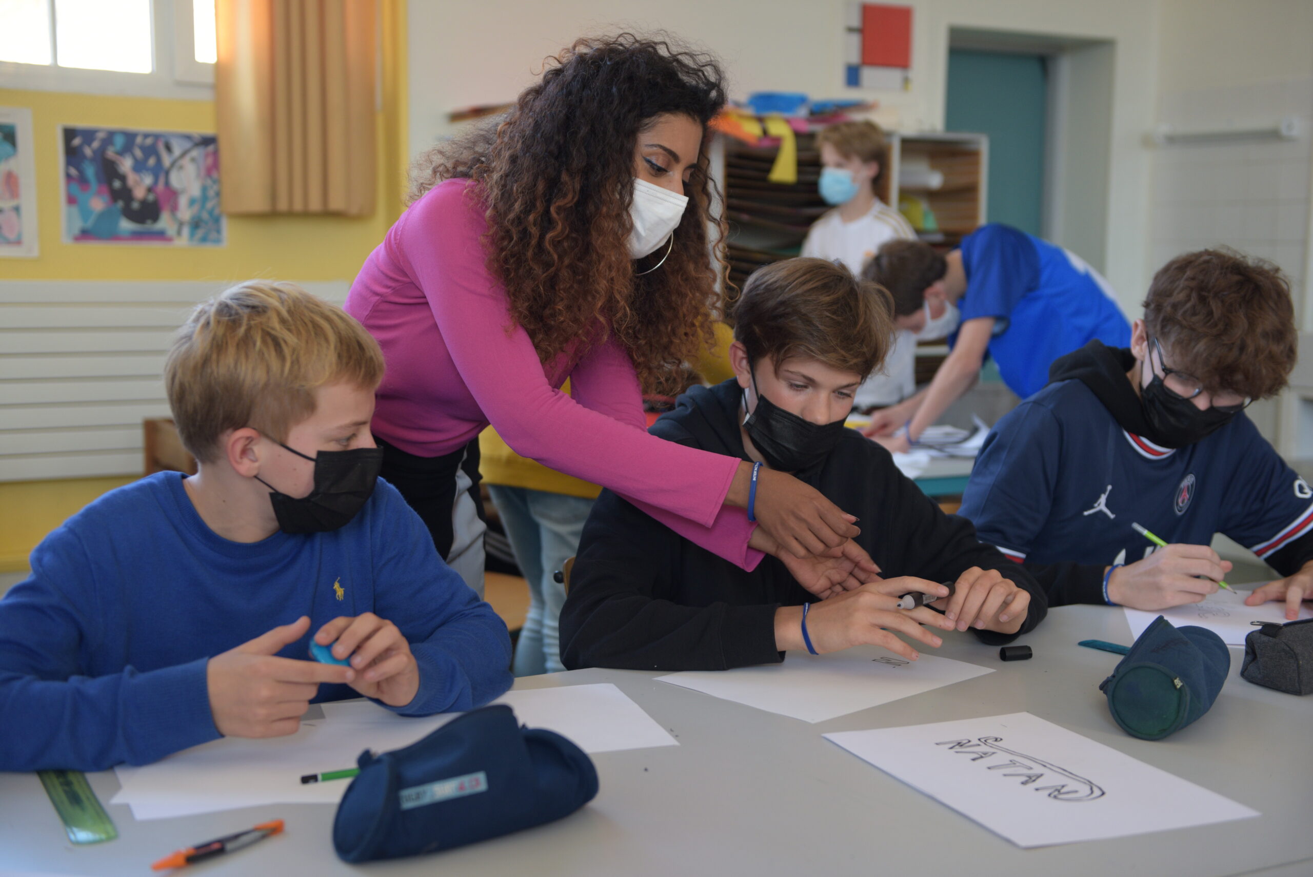 Ahlam, réfugiée yéménite, a animé un atelier de street art avec les collégiens après avoir témoigné de son parcours. Au cours de la journée, une jeune fille nigériane s’est timidement rapprochée de l’intervenante. Arrivée en France lorsqu’elle était petite, elle s’est un peu retrouvée dans l’histoire de la jeune femme.
