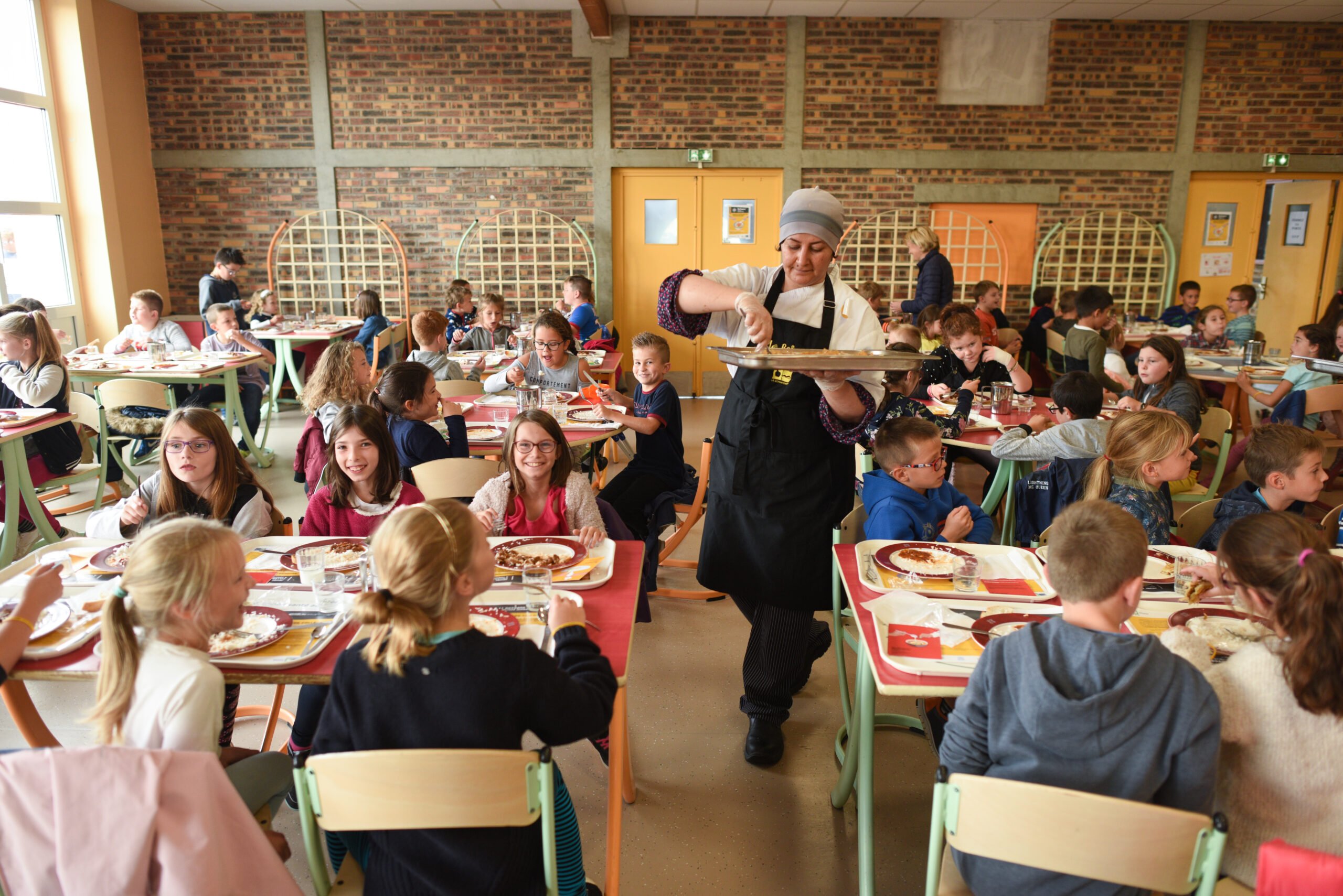 Dans les cuisines, les équipes des cantines des collèges travaillent main dans la main avec les intervenants réfugiés et les membres d’associations locales participants.