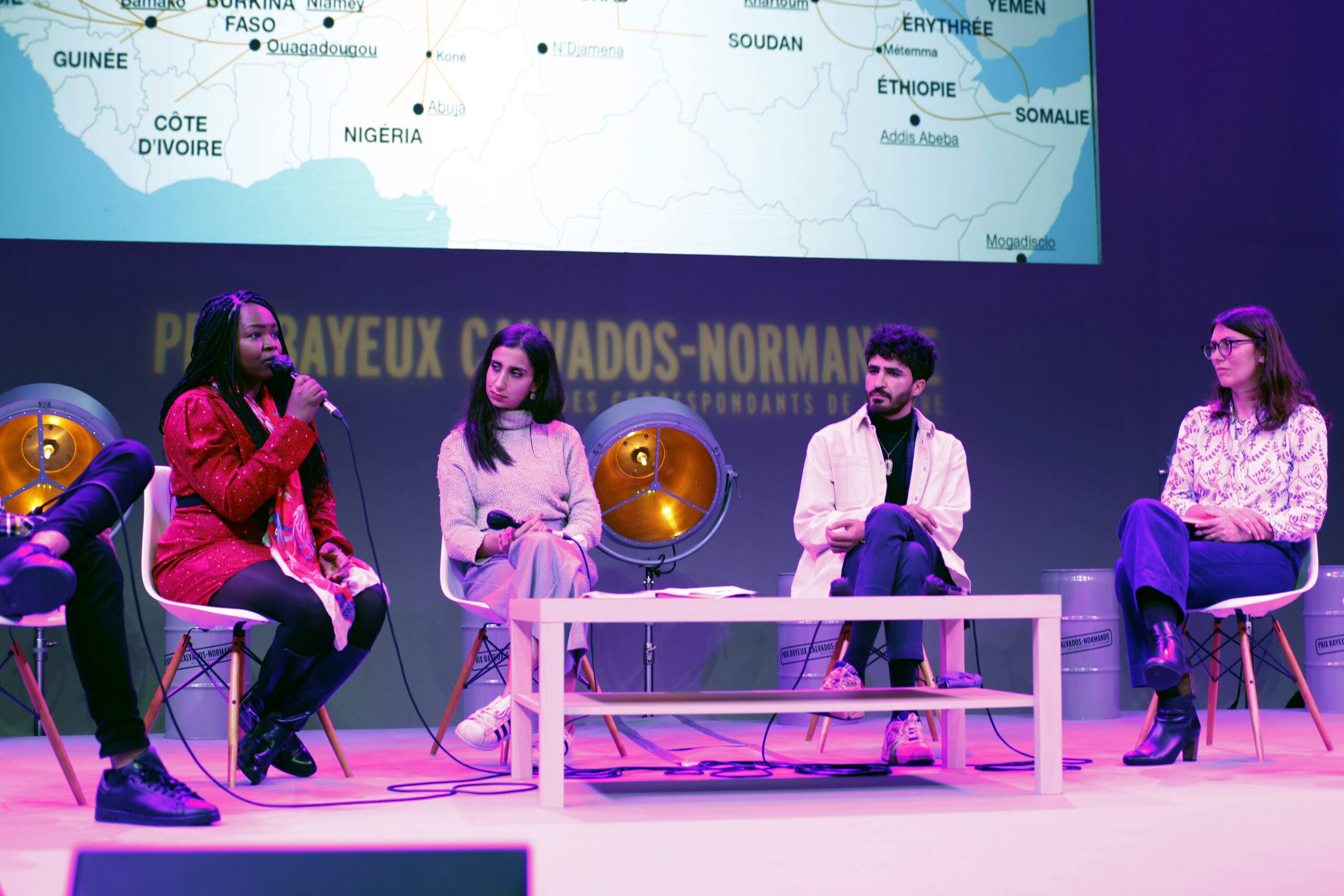 Ikhlass, réfugiée soudanaise, témoigne de son parcours devant les lycéens de la Région Normandie, lors de la 27e édition des Rencontres HCR-Ouest-France, aux cotés de Céline Schmitt, Porte-Parole du HCR en France, Azeez Sadeq, ancien réfugié, Mohamed Jamous, membre du groupe Refugees of Rap et Nina Gheddar, fondatrice du journal Guiti News.