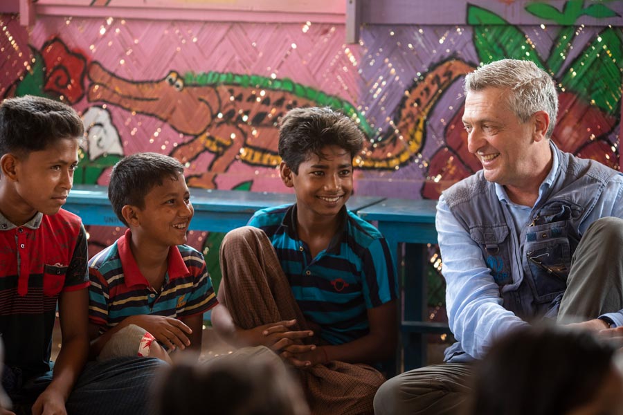 Filippo Grandi, Alto Comisionado de Naciones Unidas para los Refugiados, conoce a jóvenes estudiantes refugiados rohingya en el campamento de Kutupalong, Bangladesh. © ACNUR/WILL SWANSON