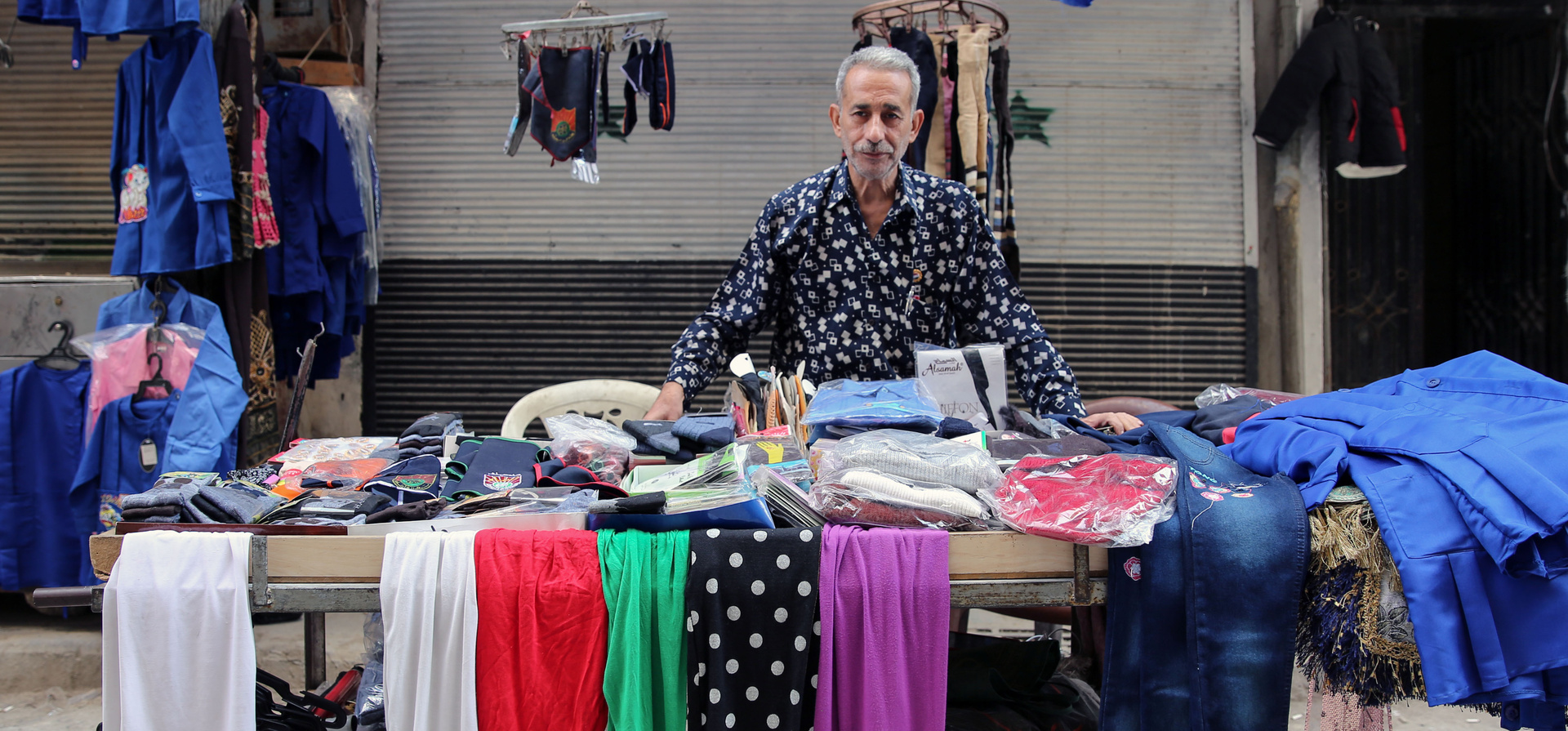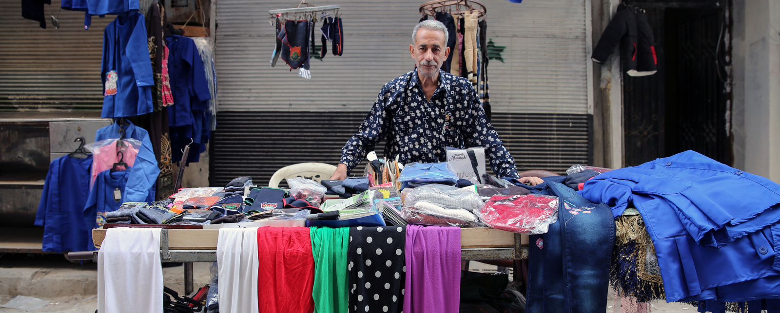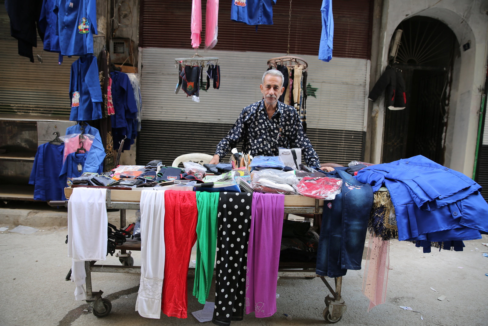 Mustafa-60 year-old and a father of four-had borrowed 150 thousand Syrian pounds (equivalent to $300) to buy clothes and school uniforms that he is selling now on a mobile cart in front of what used to be his shop. For many years he had this shop in Sad Allouz market in Al-Shaar neighborhood in east Aleppo.