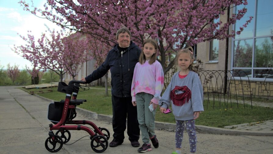 ลุดมีลา และหลานสาว กำลังยืนอยู่ข้างศูนย์แรกรับที่สนับสนุนโดย UNHCR และ Nehemia องค์กรพันธมิตร ภาพ ©UNHCR/Igor Karpenko