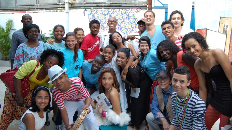 Refugees and cast members pose for a group photo after a presentation in Rio de Janeiro of “O Auto da Maré Alta.”