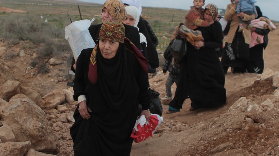 A line of Syrian refugee women, some carrying children, cross into Jordan from southern Syria. The outflow this year has been staggering.