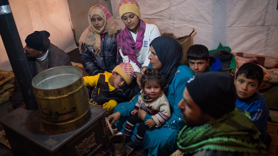 Members of a Syrian refugee family huddle around a stove inside their shelter days ago in Lebanon's Bekaa Valley.