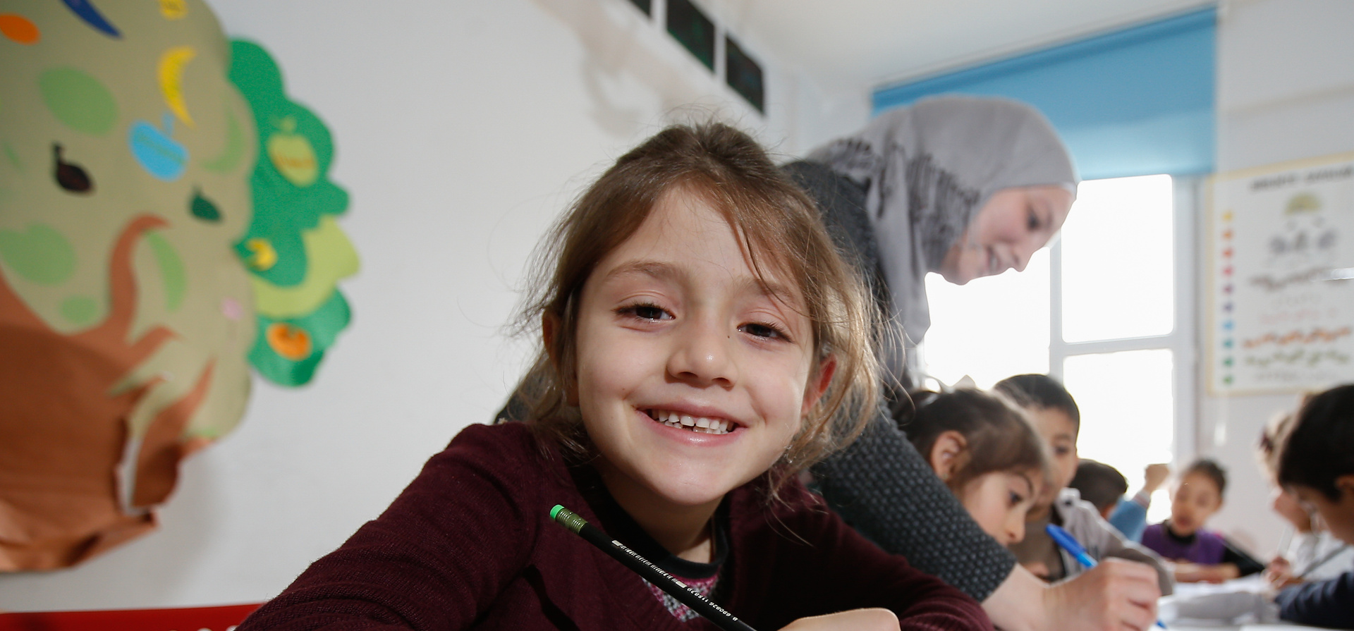 Türkiye’deki ulusal mevzuat, aileleri geçici ve uluslararası koruma talebinde bulunmuş çocuklar dâhil olmak üzere, tüm çocukların eğitim alma hakkını desteklemektedir. UNHCR, ortak kuruluşlarıyla birlikte yürüttüğü çalışmalarla mültecilerin bu haklar hakkında bilgi sahibi olmalarını ve çocuklarını okula kaydettirmek için izlemeleri gereken prosedürlere ilişkin yardım almalarını sağlamaktadır. Türkçe dil yeterliliği akademik başarı için kilit önem taşıdığından, UNHCR Milli Eğitim Bakanlığı (MEB) ile çalışmalar yürüterek çocukların Türkçe eğitiminde daha fazla destek almasını sağlamaktadır. MEB ve tüm eğitim paydaşları, mülteci çocukların karşılaşabileceği kendilerine özgü zorlukları ele alan kapsayıcı öğrenme ortamlarının oluşturulması için destek sağlamaktadır.