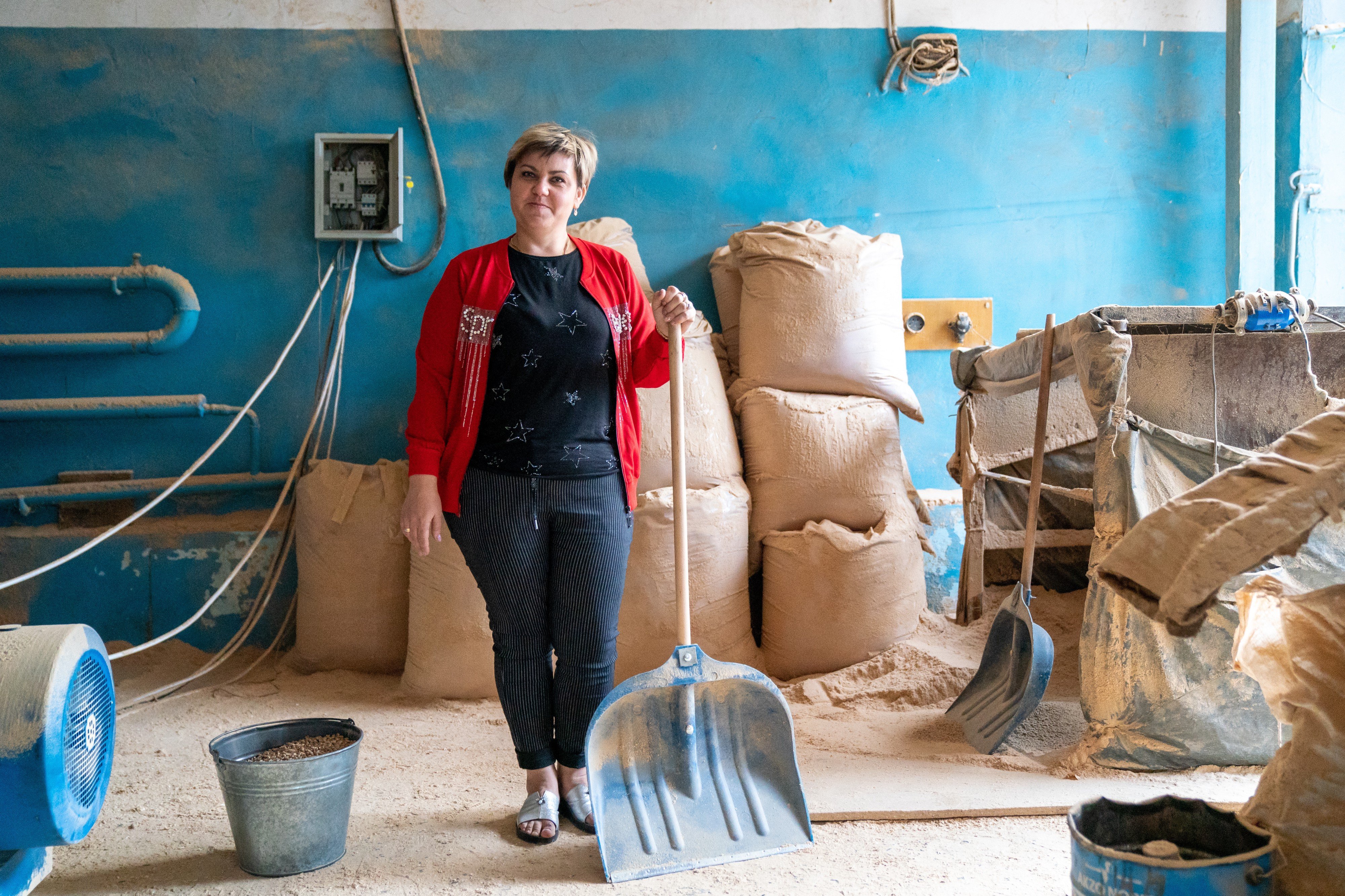 Oksana is an IDP who moved with her husband and two children from the conflict-affected town of Toretsk, in Eastern Ukraine to Kharkiv. She produces wood dust pellets that are used for heating as an alternative to gas, coal or firewood.