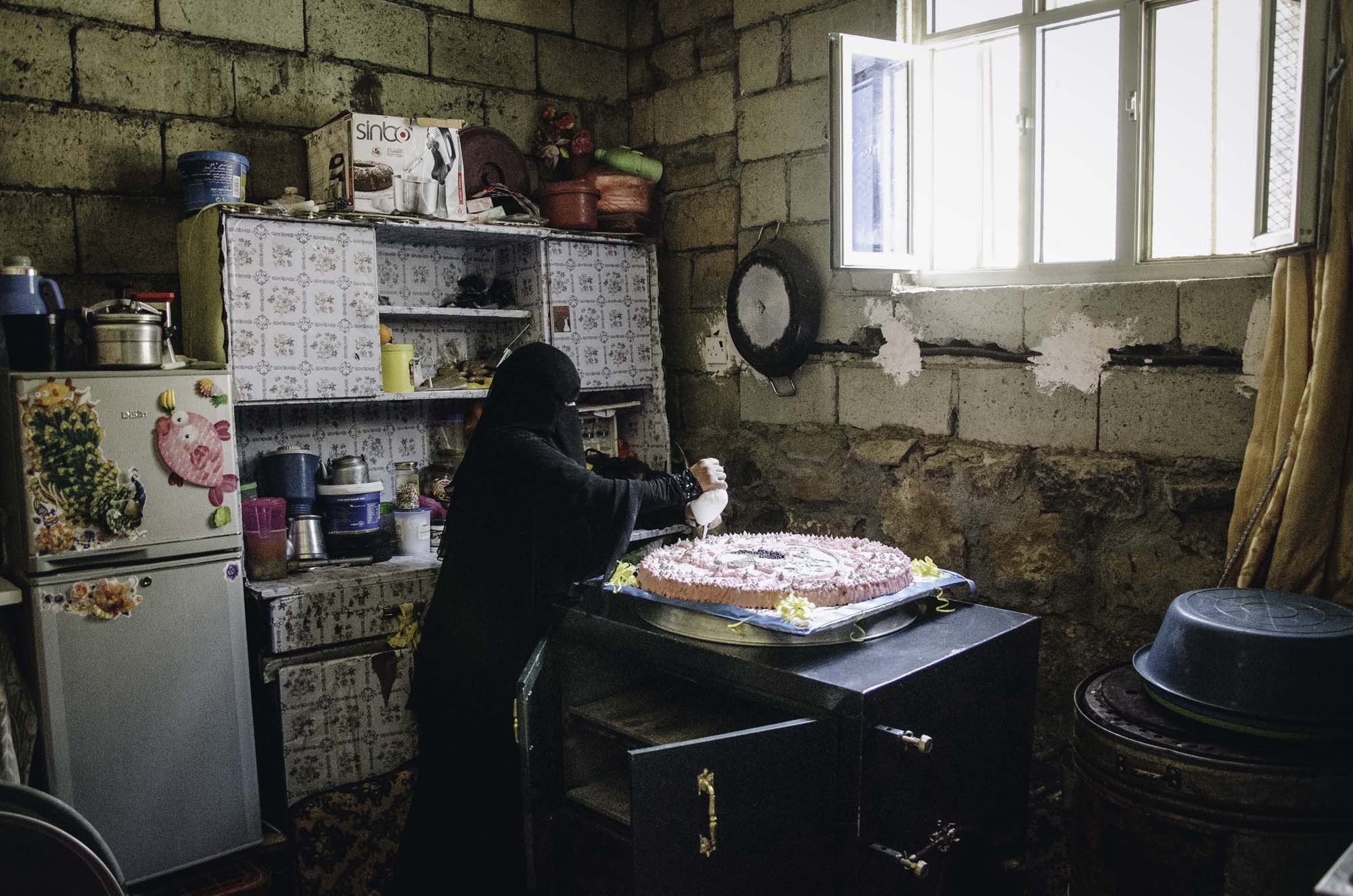 An internally displaced woman entrepreneur in Yemen bakes a birthday cake. Since March 2015, thousands of families in Yemen have fled their homes because of the conflict. Though each woman suffered from the impact of the war in a different way, they all have one thing in common: the spirit of resilience