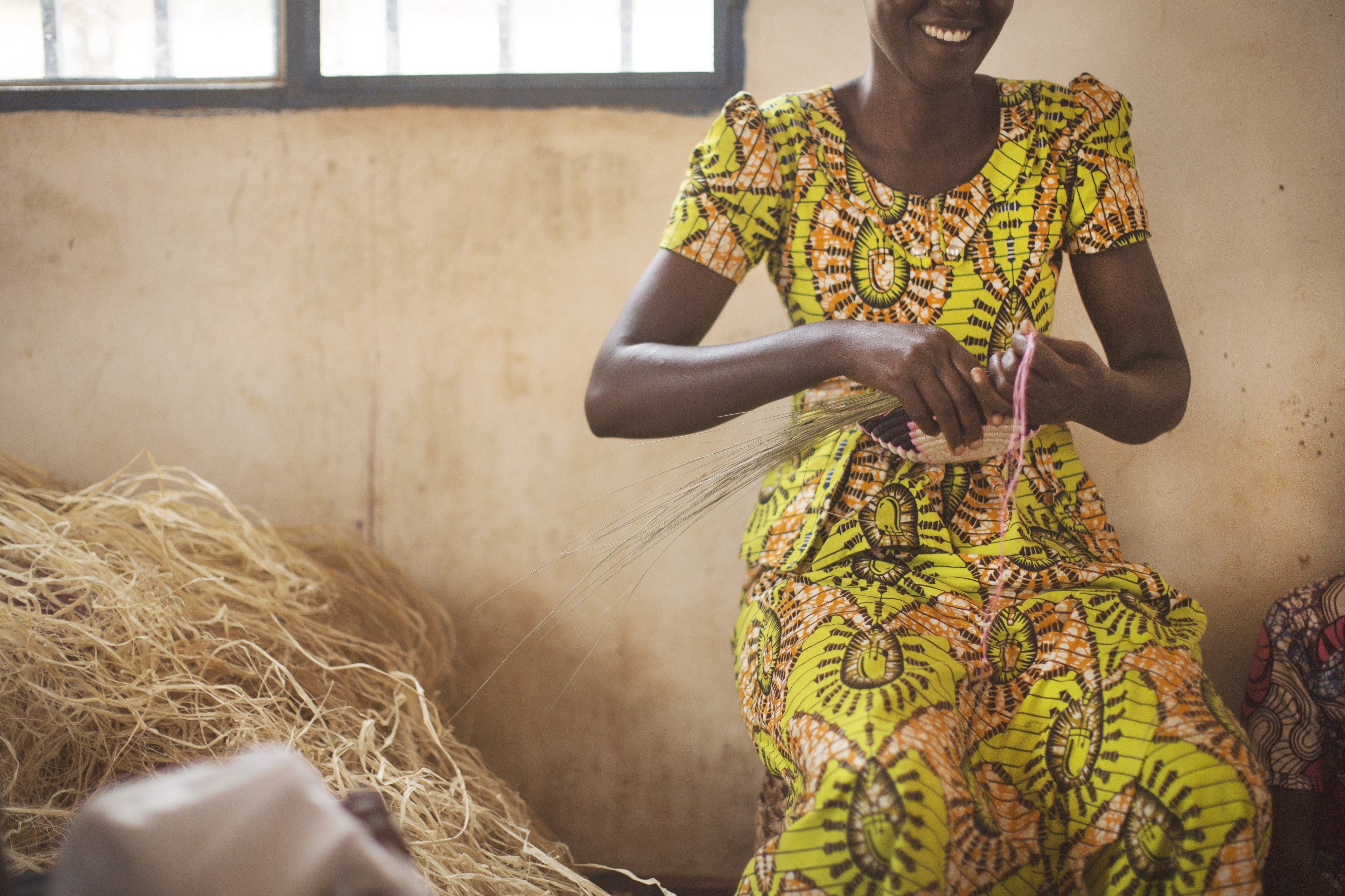 Refugee artisans weaving baskets in Mahama Refugee camp, Rwanda. They are crafting woven products that are exported to international markets. This project secures a sustainable income for the women.