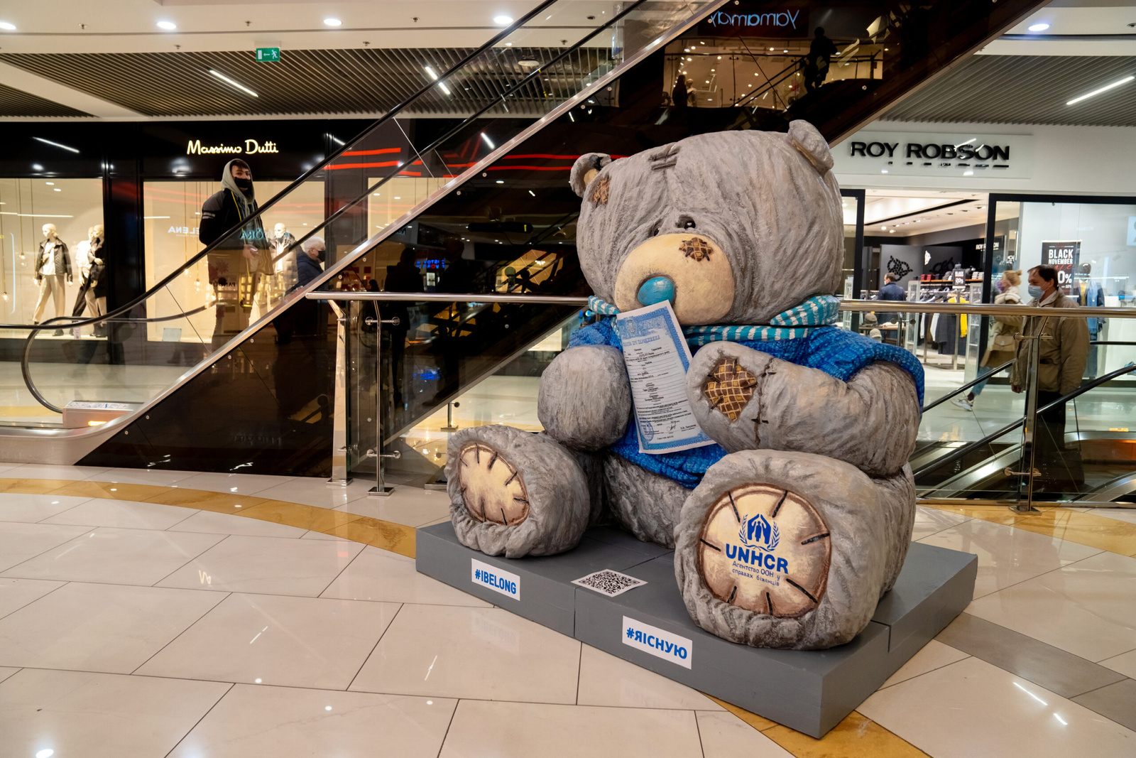 On 12 November, a show dedicated to the campaign was projected on the media-façade of the Gulliver Mall in Kyiv (1-A Sportyvna Square). Also from the same date, a giant teddy bear holding a birth certificate was exhibited in the entrance hall of the Gulliver Mall for four days, until 15 November. This installation titled 'Invisible Children: Under the Risk of Statelessness' evokes the risk of statelessness among children born in non-government controlled parts of Ukraine and who have not yet obtained a Ukrainian birth certificate. One of the 10 actions to end statelessness is to ensure birth registration for the prevention of statelessness.