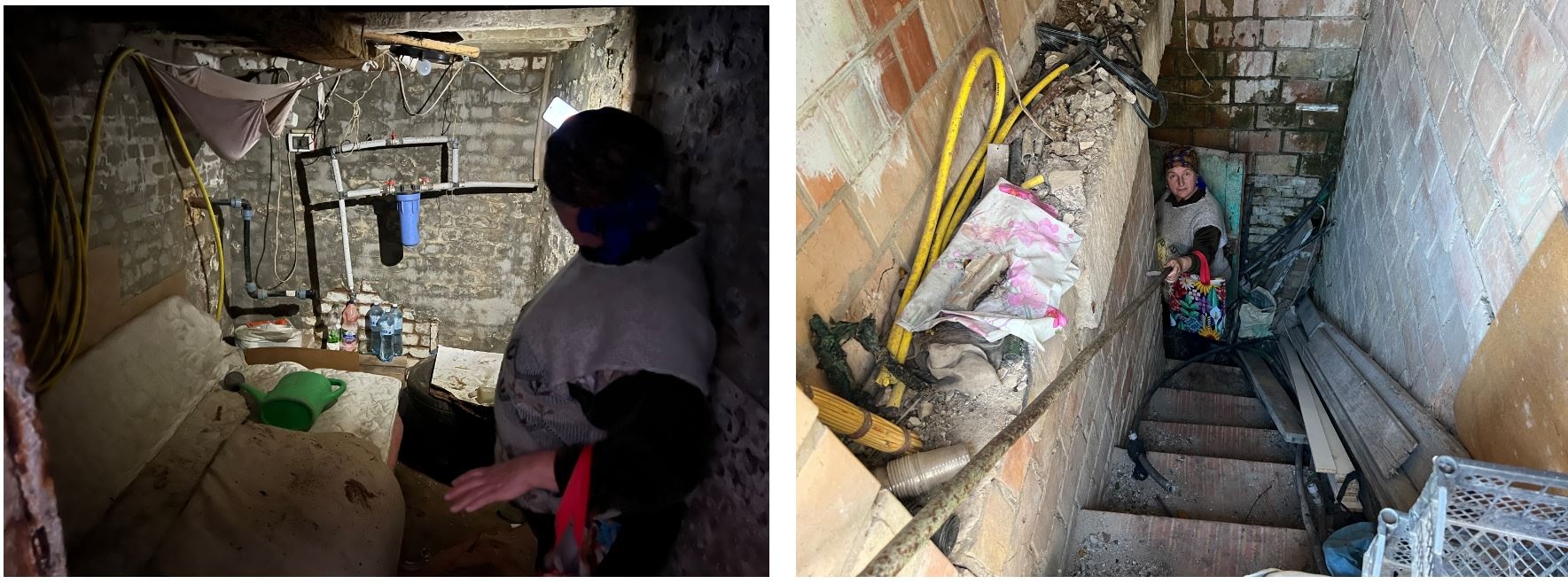 Розмову Надії з онуком перервали раптові гучні вибухи неподалік. Надія одразу побігла у підвал. «Слава Богу, я згадала взяти маленьку сумку з документами», — каже Надія. З підвалу вона почула ще два вибухи, і стіни підвалу затремтіли. Побоюючись за свою безпеку, Надія сиділа в підвалі, поки вибухи не стихли.