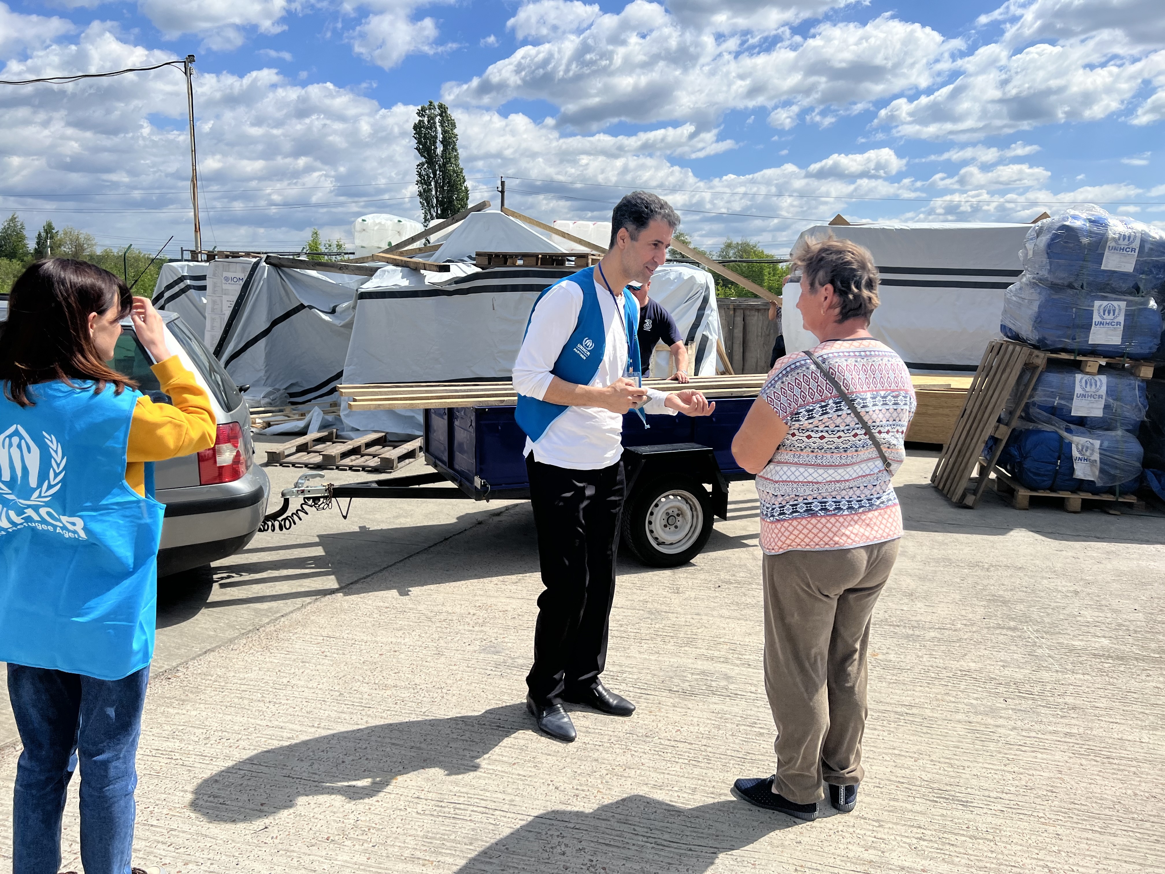 "Сьогодні ми роздаємо комплекти для тимчасового житла в гостомельській громаді, яка складається з чотирьох сіл. Усі вони були сильно обстріляні та знищені. Цього тижня ми роздамо набори для 100 домогосподарств", – каже Аббас, зустрічаючись з людьми на гуманітарному складі зі своєю колегою Наталією.
