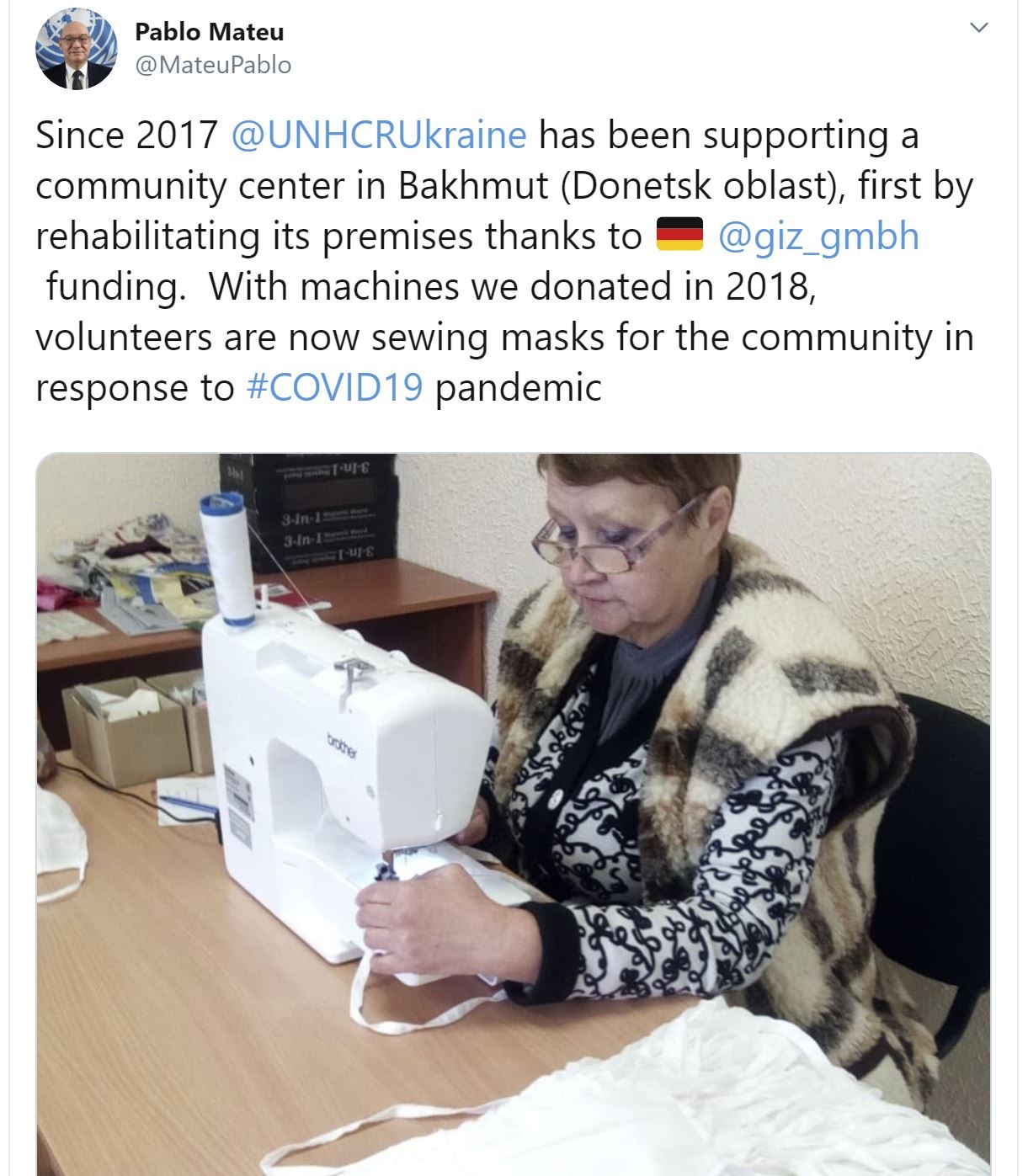 Протягом тижня з 23 по 27 березня УВКБ ООН та його партнер - громадська організація «Проліска» підтримали одинадцять ініціатив з виготовлення медичних масок від громад, розташованих поблизу лінії розмежування на сході України. Члени громади виготовлятимуть медичні маски для медичних працівників, персоналу амбулаторій, фельдшерських пунктів, лікарень, будинків людей похилого віку, працівників комунальних закладів та стратегічних підприємств, що працюють на територіях поблизу лінії розмежування в Донецькій та Луганській областях. Маски будуть виготовлені відповідно до рекомендацій ВООЗ.