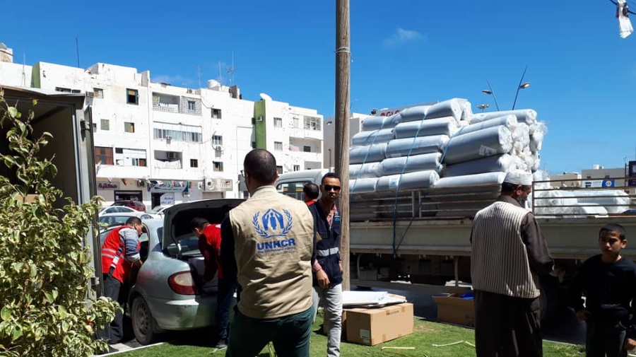 UNHCR staff distribute relief items to displaced families in Misrata, Libya.