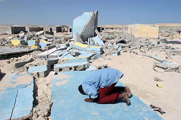 Few buildings stand in Teunom, one of the hard-hit towns along the west coast of Aceh province that have been inaccessible to organized relief efforts. No cleanup has taken place in the area. Some residents have been scavenging in the debris and putting together ramshackle houses in their demolished property. The stench of death is pervasive a month after the disaster. The area is cut off from the nearest main city of Meulaboh with large portions of the asphalt road and bridges destroyed. The harbour has been damaged and only very small boats can enter the port. Supplies can only be flown in by helicopter.
