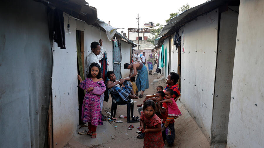 A group of Rohingya families sit outside their makeshift homes on the outskirts of Jammu, India, May 2017.