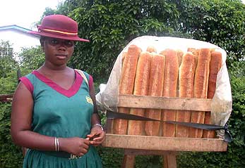 Liberian refugee Zinnah Mansally – in UNHCR-sponsored school uniform – selling bread after school in Freetown.