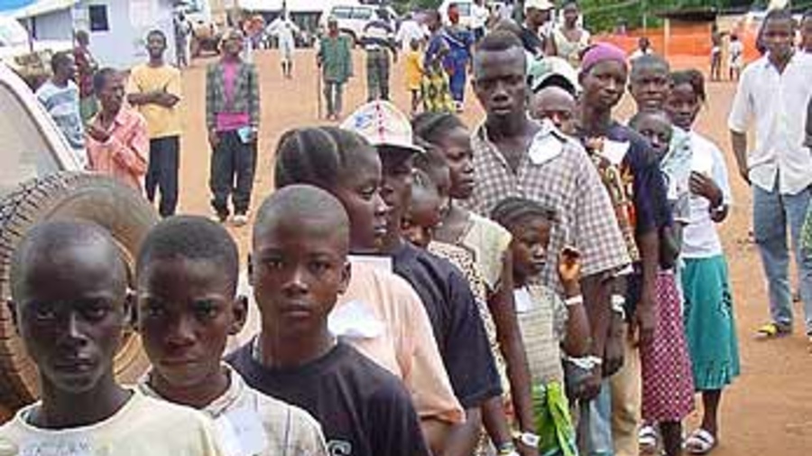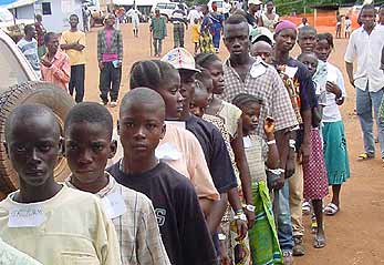 Recent arrivals from Liberia queue to register with UNHCR in Nonah camp, Yomou, Guinea.