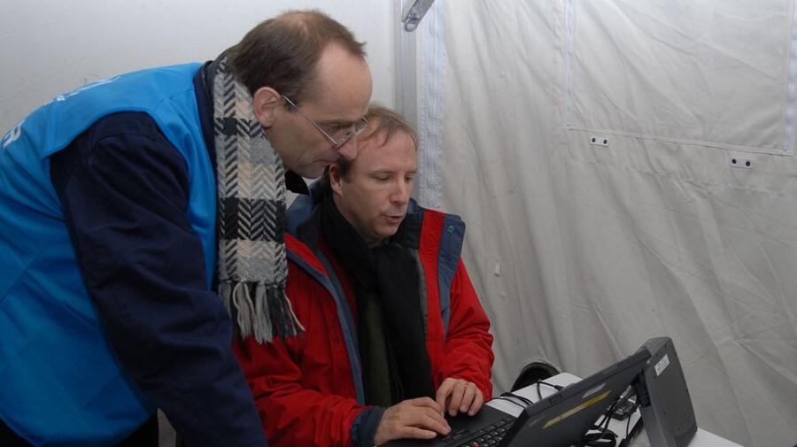 Two UNHCR staff members, well padded against the cold, take part in the emergency training in Sweden.