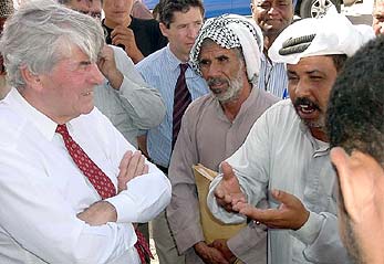 High Commissioner Ruud Lubbers with Iranian refugees at a transit centre outside Basra. Harassed in their settlements in Southern Iraq yet refused entry back into Iran, these refugees have been stranded near the border for months.