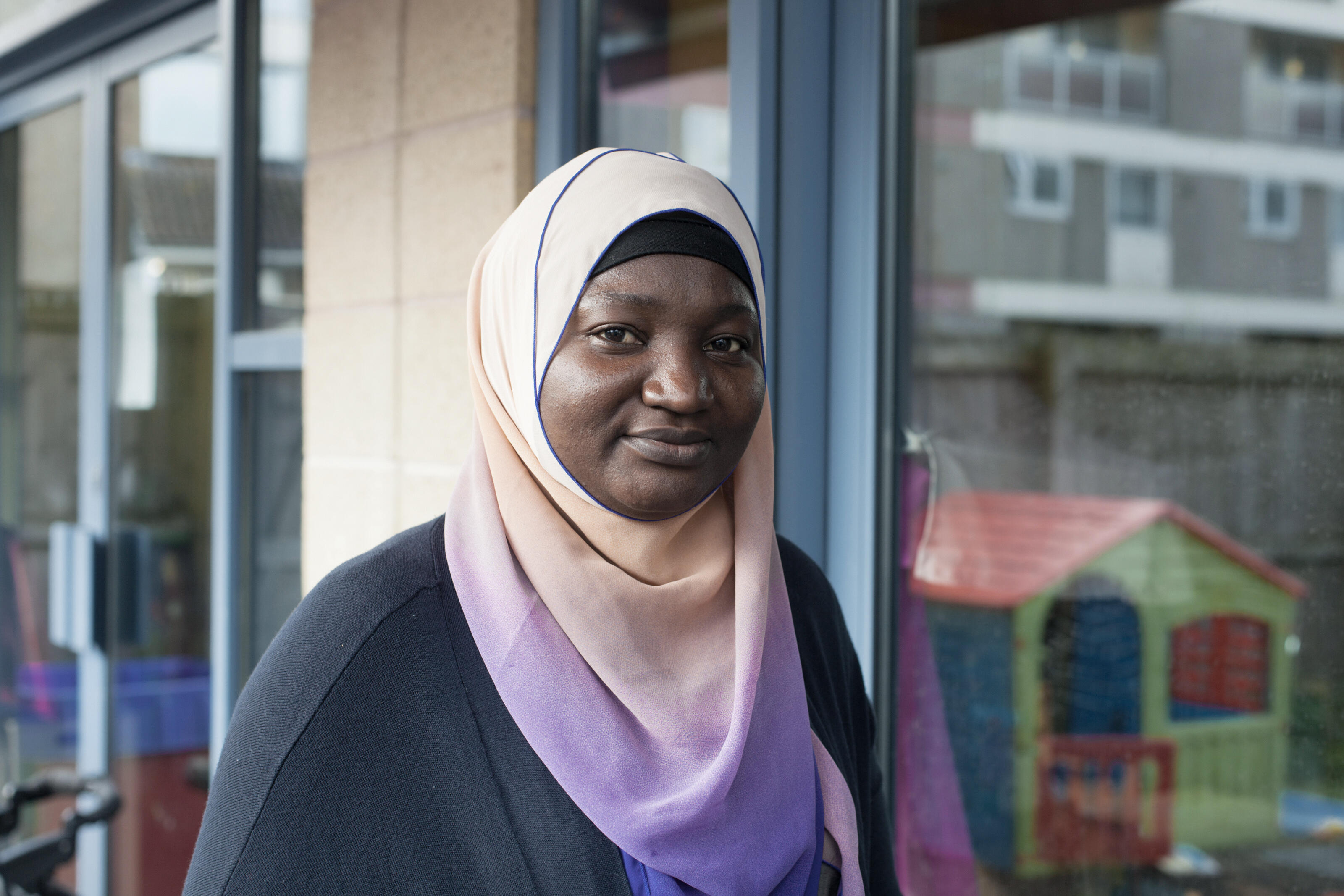 Mansura, an asylum seeker from Ghana, stands outside in the playground as she picks her son Ibrahim from The Early Years Project.