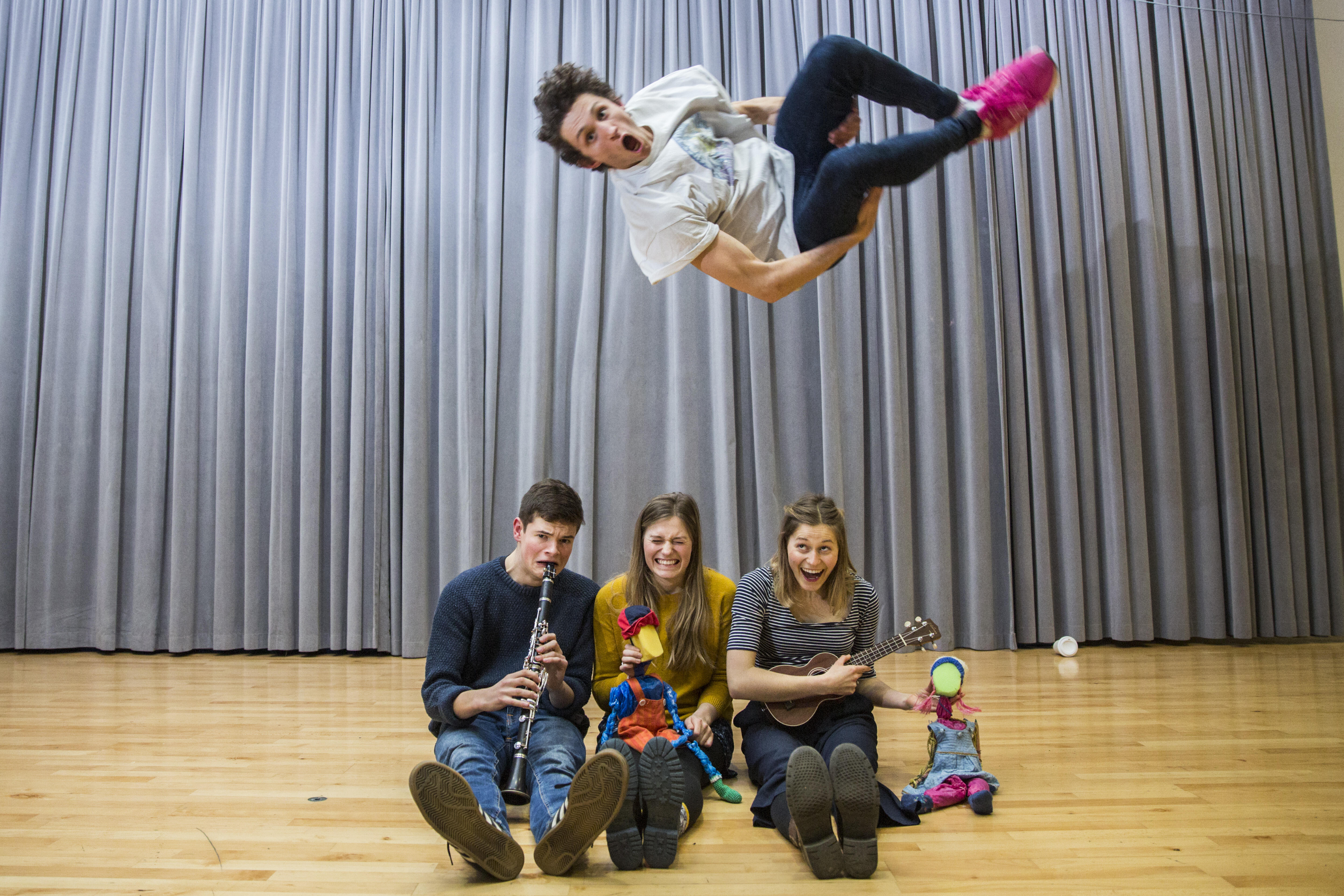 From left to right; Edward Holmes, 19, clarinetist, Mhairi Gayer, 21, actress, Jay Jones, 23, acrobat and actor, and Leah Gayer, 21, actress, pictured during a rehearsal of the Wind-up Penguin Theatre Group at the Guildhall School of Music and Drama, in London.