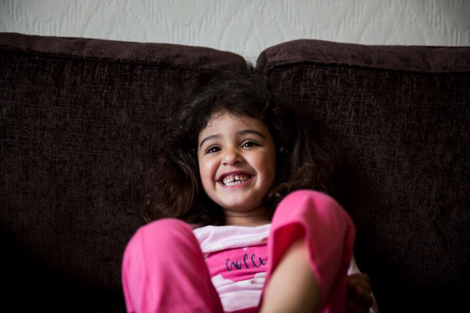 Jinan, 5, from Quneitra, Syria, in her family's new home in Edinburgh.