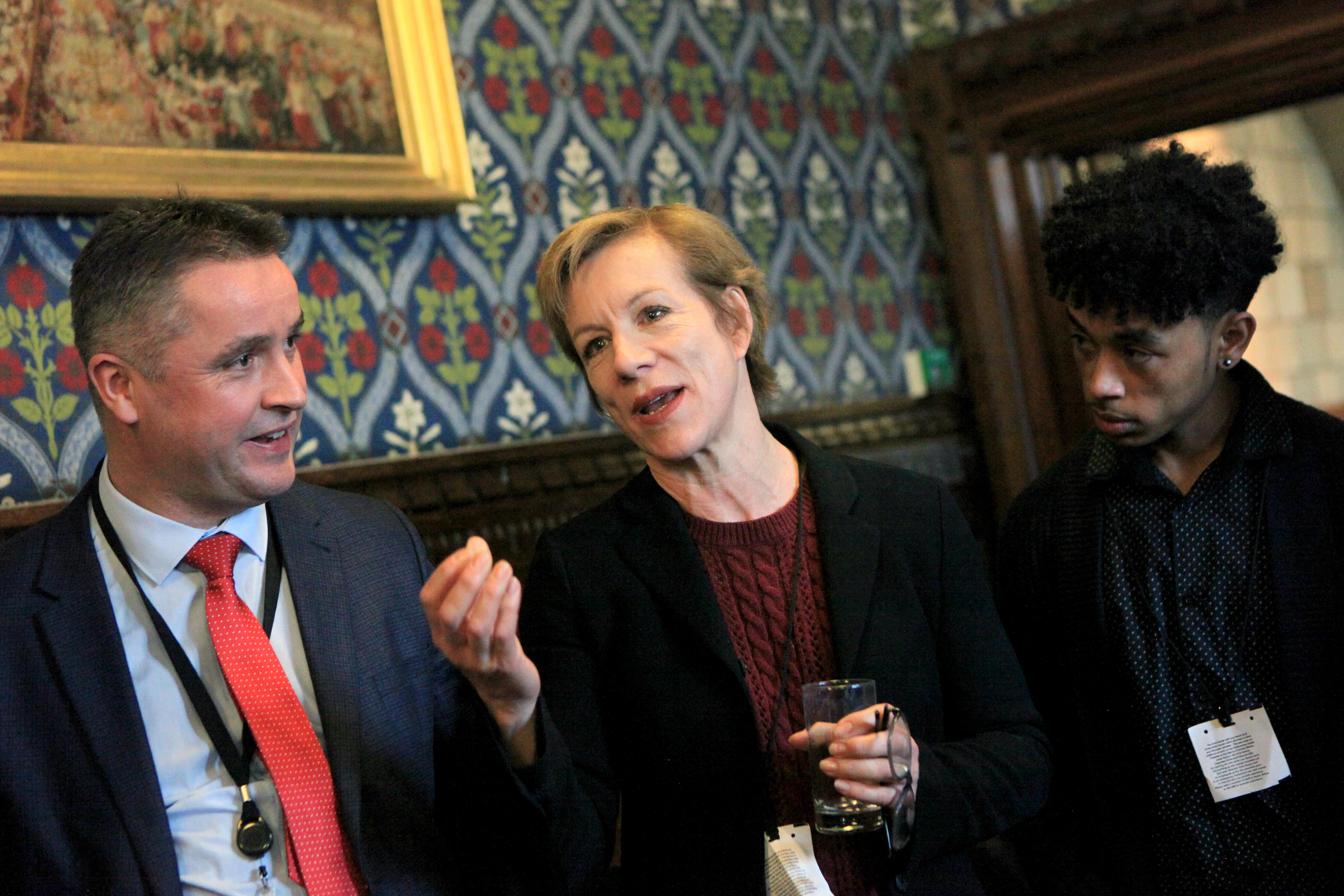 Standing with Angus McNeil MP and Yohannes, a 19-year-old Eritrean refugee, Actor Juliet Stevenson delivers a speech at the post-debate reception, following the passing of the second reading of the Refugees (Family Reunion) Bill on Friday 16th March.