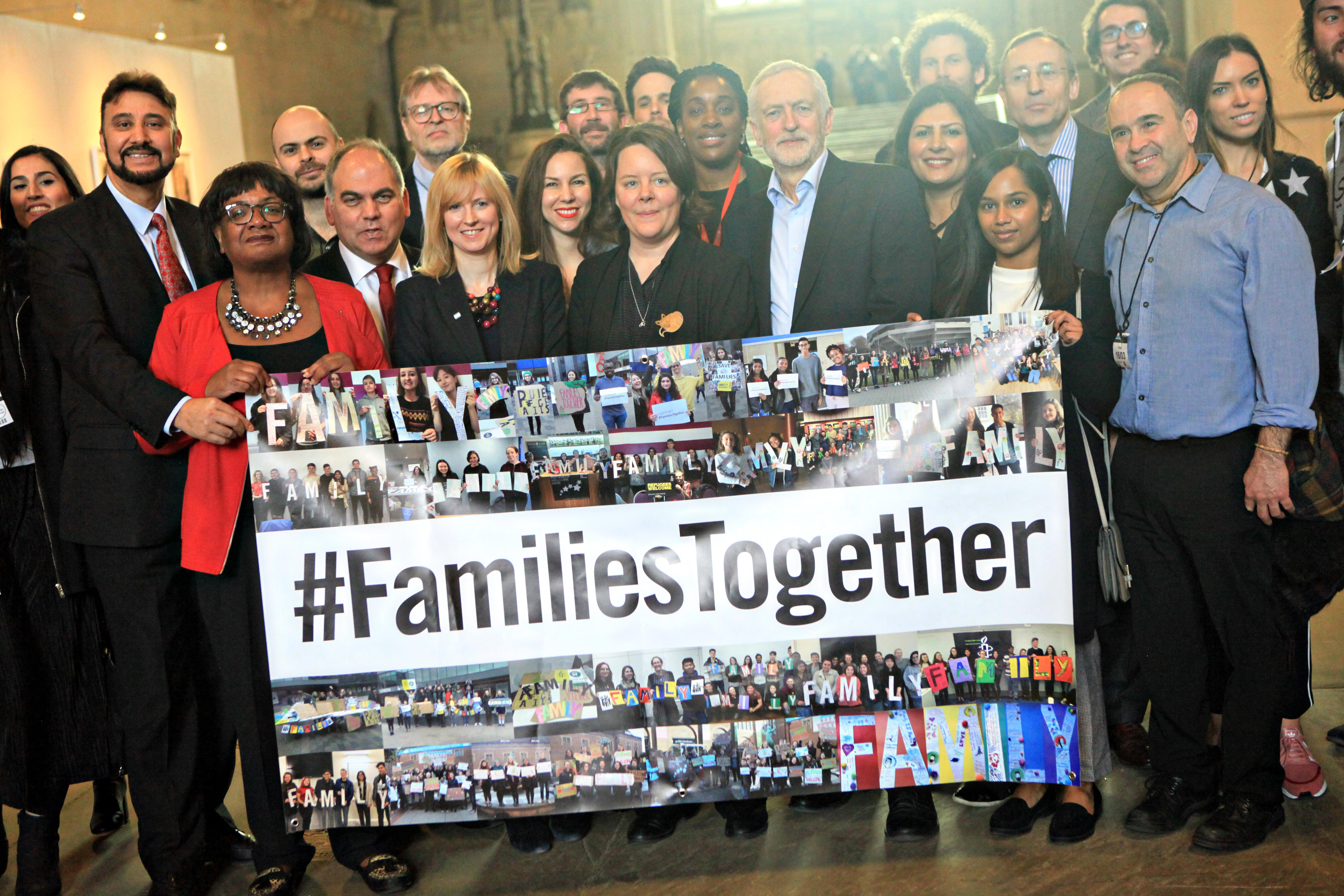 Opposition leader Jeremy Corbyn and Labour MPs stand alongside staff from UNHCR, Amnesty International and Refugee Council, following the passing of the Refugees (Family Reunion) Bill's second reading last Friday.