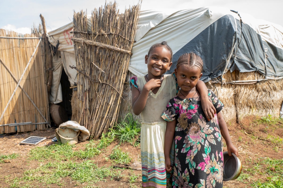 Two refugee girls outside their shelters in Um Rakuba refugee camp in eastern Sudan.