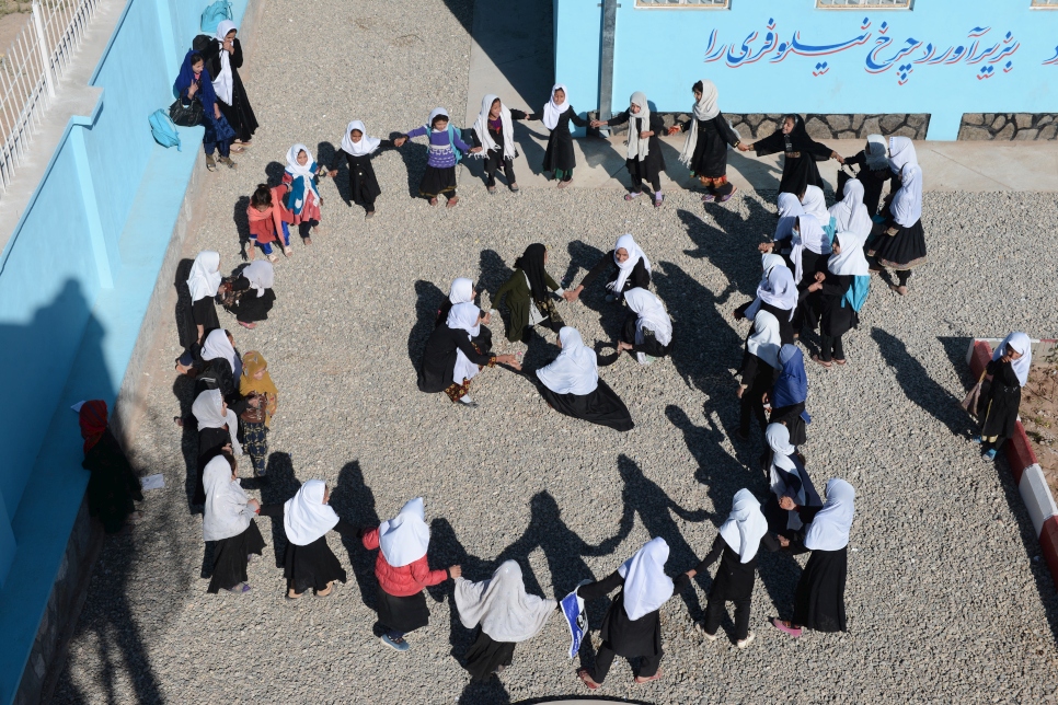 Displaced Afghan schoolgirls play during a break at Kahdistan Secondary School in Injil district of Herat province, Afghanistan, November 2020.