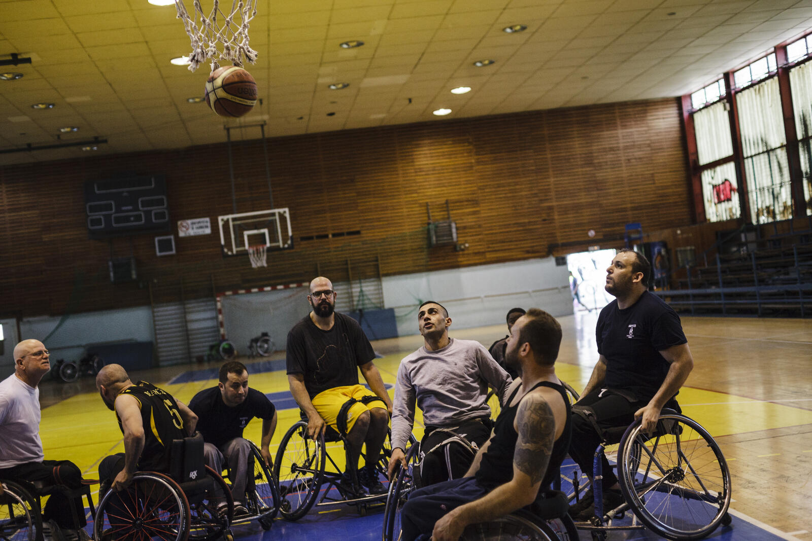 Ibrahim commits himself to a rigorous sports training schedule. Three days per week, he swims with ALMA, a Greek non-profit organization for athletes with disabilities. His training is held in the former 2004 Olympic sport complex in Athens. He is also part of a wheelchair basketball team in Maroussi, an Athens suburb, that meets five times per week and travels across the country for games.