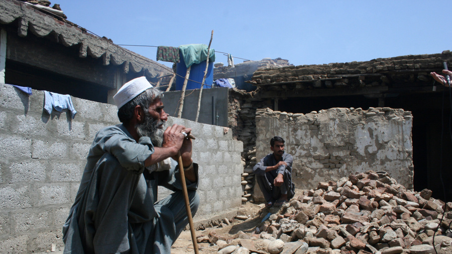 In Paranmandheri village, Khewagar sits outside the rubble of his home after returning. The 50-year-old, who lost a leg in an accident more than a decade ago, fled to safety in Mardan District last year after shell fire destroyed his house and killed his two sons and five other relatives.