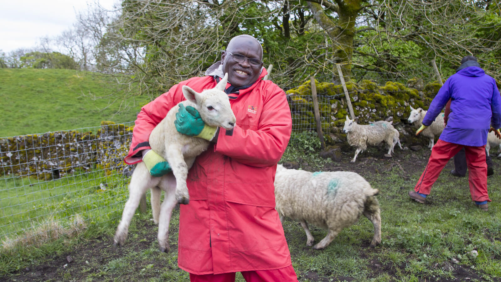 Salama Osman, 56, is originally from Sudan. He is volunteering on Rodney Beresford's sheep farm in the Yorkshire Dales. This is part of a project run by the Yorkshire Dales Millennium Trust to help refugees and asylum-seekers to enjoy English country life and get some fresh air out of the city.