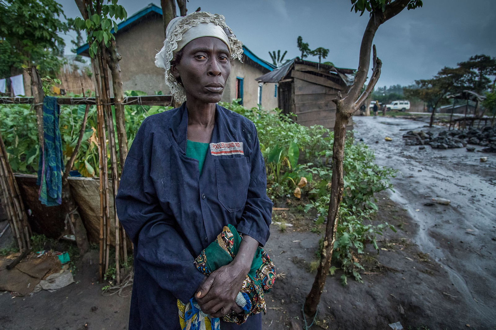 Among them is a woman I'll call Célestine, a 48-year-old mother of three. Seeking respite from the rain here in Rutshuru, a 70-kilometre drive north of Goma, she holds a small piece of plastic tarpaulin above her head.