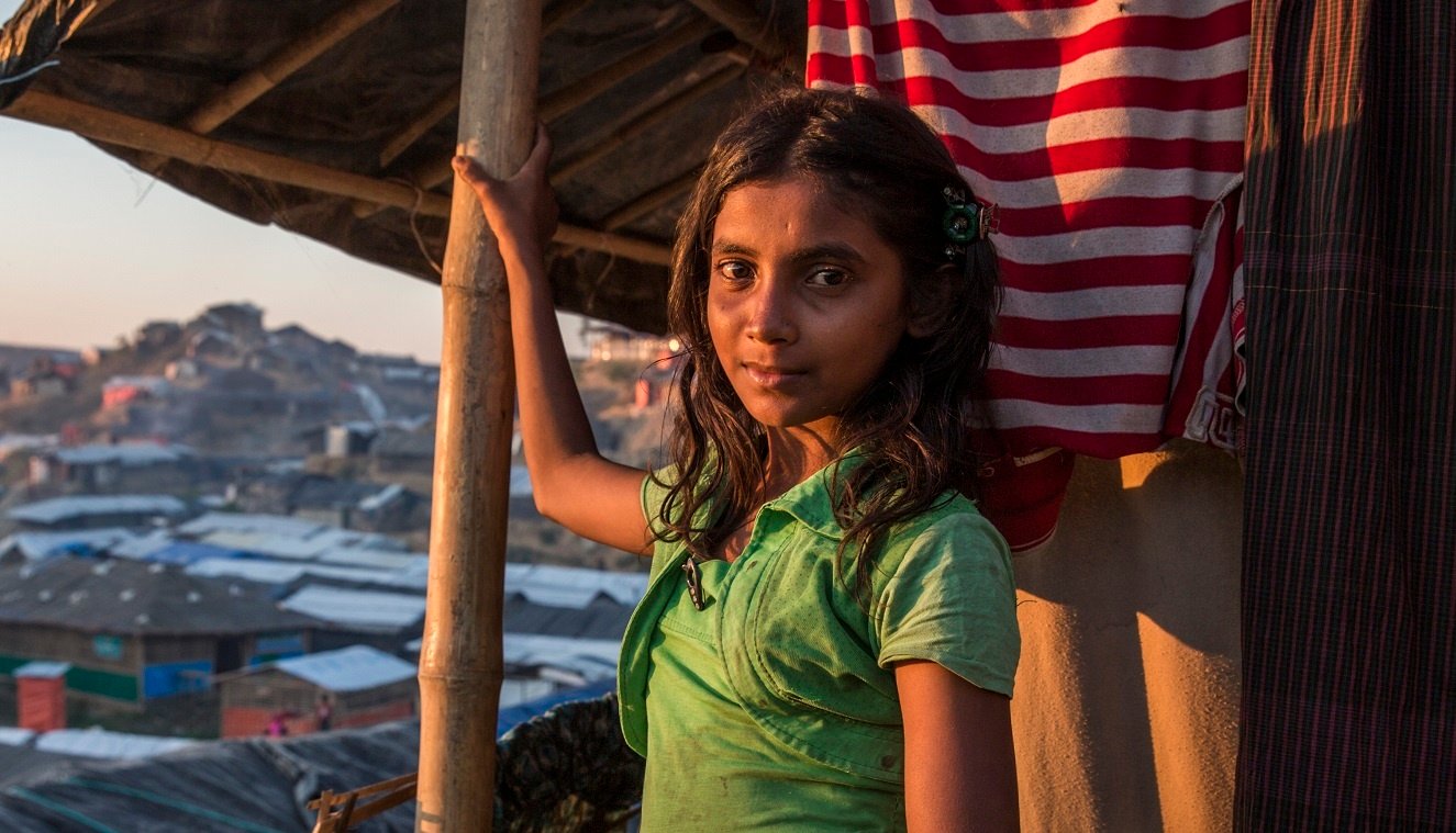 Thirteen-year-old Rohingya refugee Rezuana, 13 stands outside her family's shelter at Balukhali camp in Bangladesh.