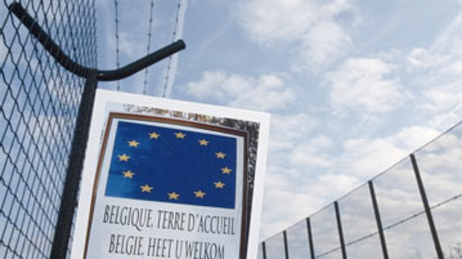 "Belgium, land of welcome." A concept photograph taken in Detention Centre 127-bis, one of 17 images being displayed on buildings in Brussels to draw attention to the issue of detention centres.