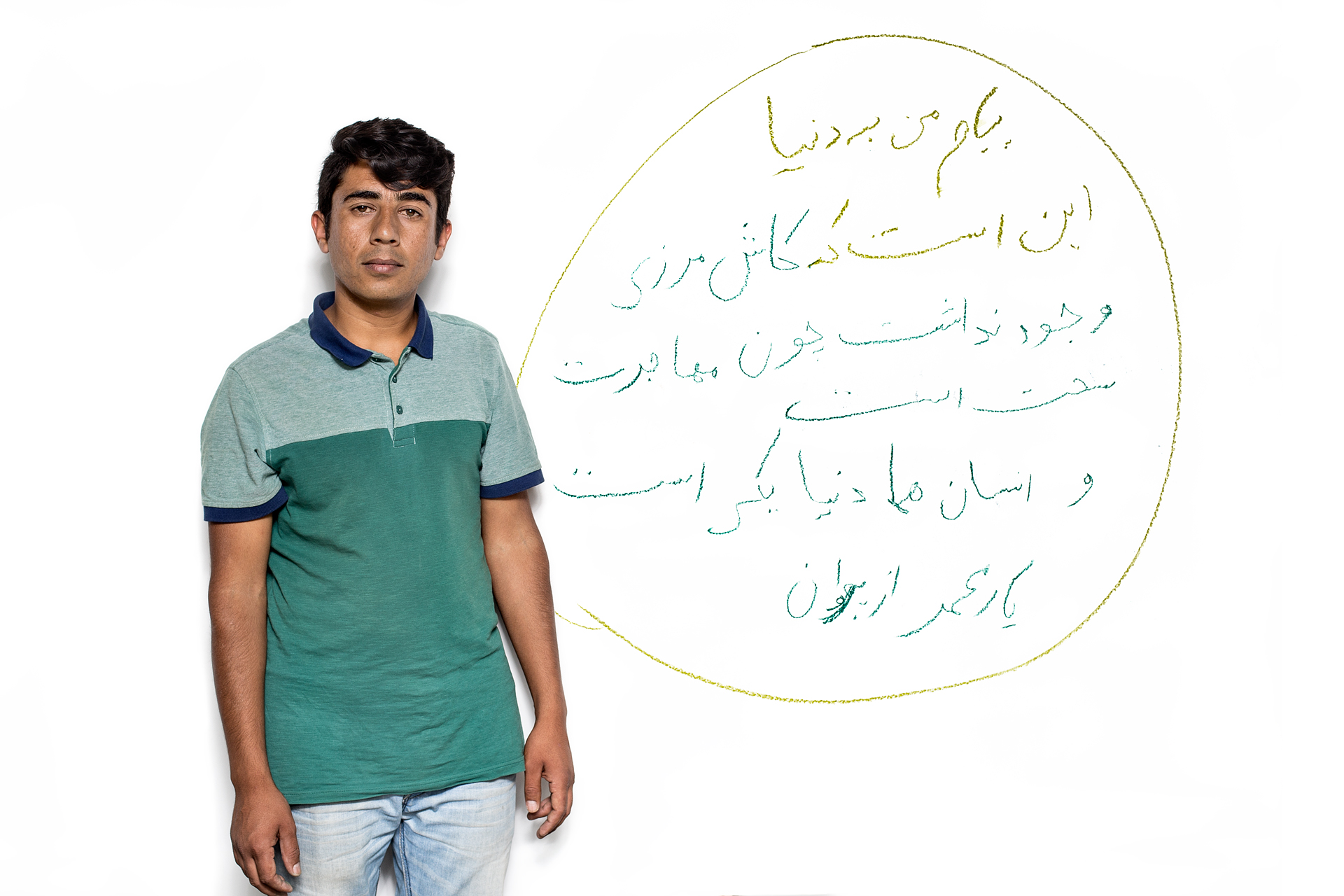 As many thousands of people arrived in the Hungarian capital, Gábor and three fellow artists set up a large roll of paper in Keleti train station. Refugees and volunteers were asked to write and draw their impressions, dreams and experiences. Then, each one was photographed alongside this personal "message to the world."