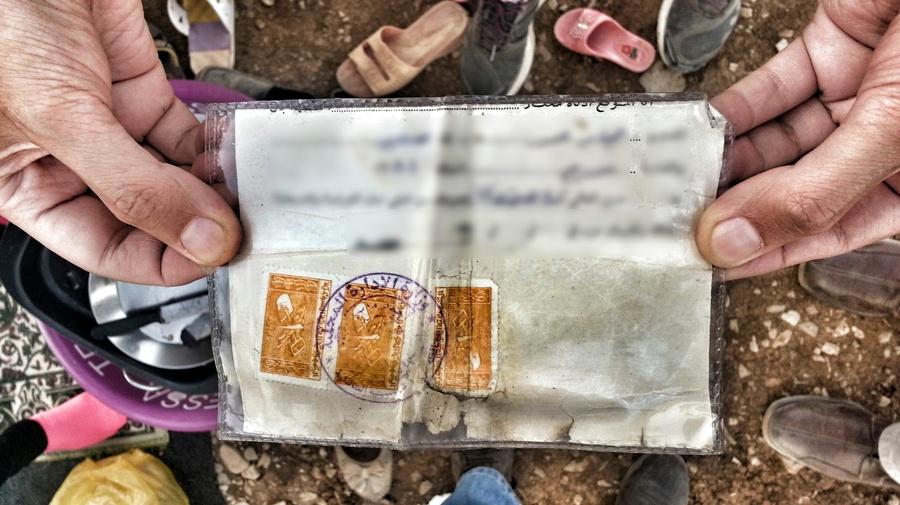 A Syrian refugee shows UNHCR his "maktoumeen" card issued in Syria. This document, given to unregistered stateless Kurds, confers no rights or status.