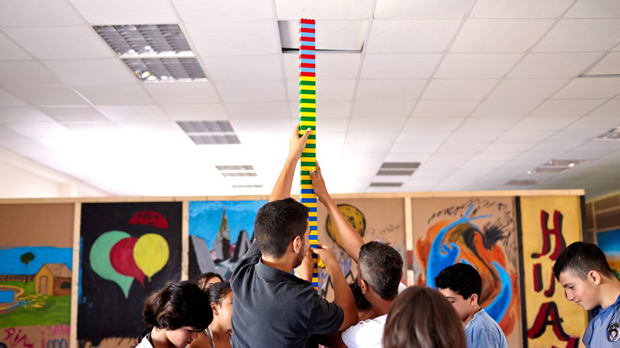 Children build a strong and steady tower with LEGO bricks during a team-building and conflict-resolution exercise at a shelter in Lebanon.