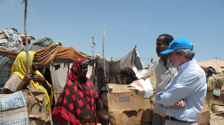 UN Deputy High Commissioner for Refugees, T. Alexander Aleinikoff, talks to internally displaced people at a camp in Bossaso, a city in the northern state of Puntland, Somalia.