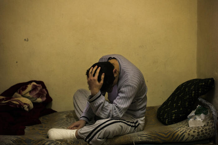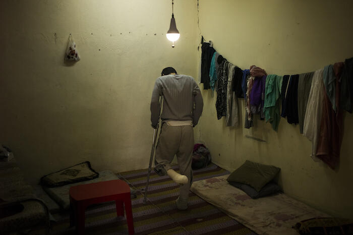 Sitting on a thin mattress atop a metal bed frame, hunched over his bandaged leg, Asam recounts the circumstances of his injury with little emotion.