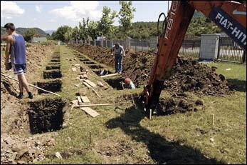 Preparing new grave sites in Srebrenica in preparation for 10th anniversary remembrance services on Monday, July 11, in the Bosnian town.